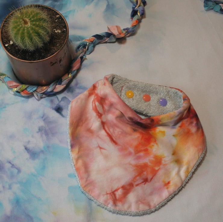 These beautifully patterned and soft Bibs are made from Bamboo Jersey and Bamboo Terry Towelling. These materials are super soft, absorbant and much more eco friendly than cotton. The pattern have been hand ice-dyed and has the added advantage of hiding dribble stains incredibly well - take it from a Mum who knows!