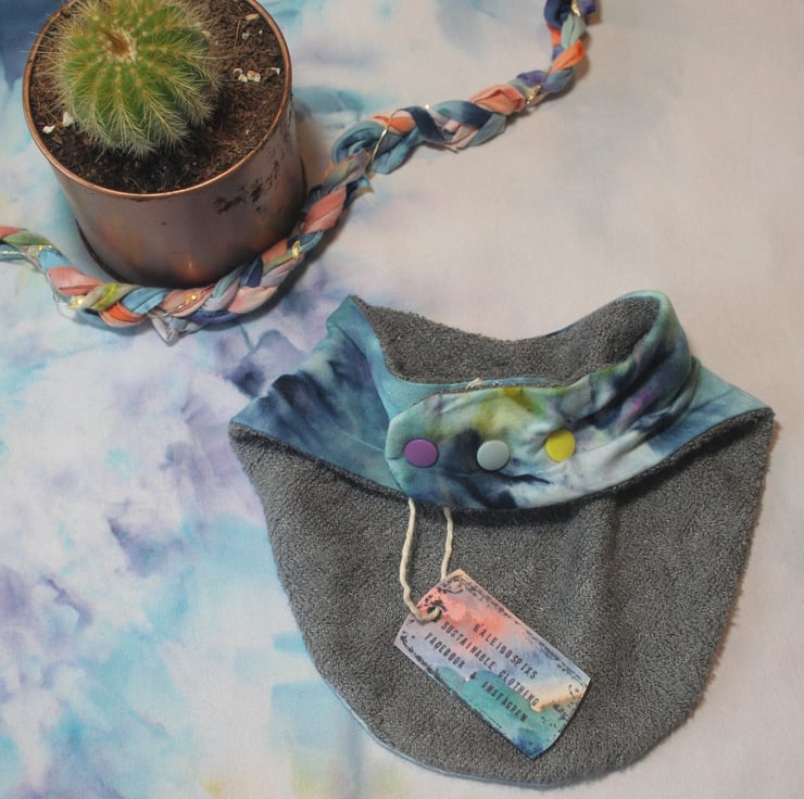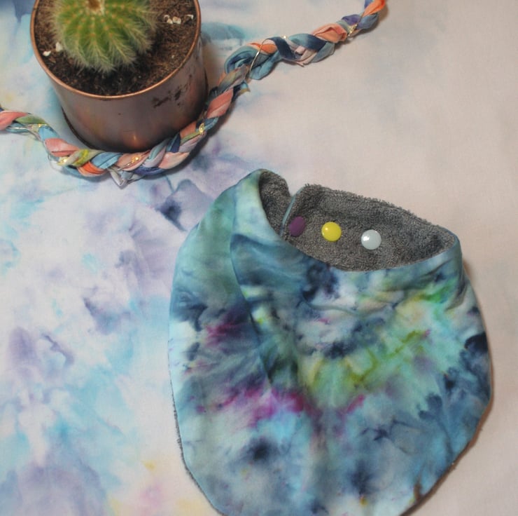 This beautifully patterned and soft Bib is made from Bamboo Jersey and Bamboo Terry Towelling. These materials are super soft, absorbant and much more eco friendly than cotton. The pattern has been hand ice-dyed and has the added advantage of hiding dribble stains incredibly well - take it from a Mum who knows! The rounded shape allows for more coverage - perfect for teething.