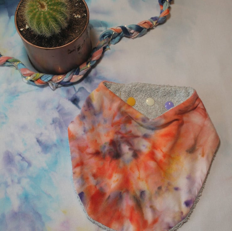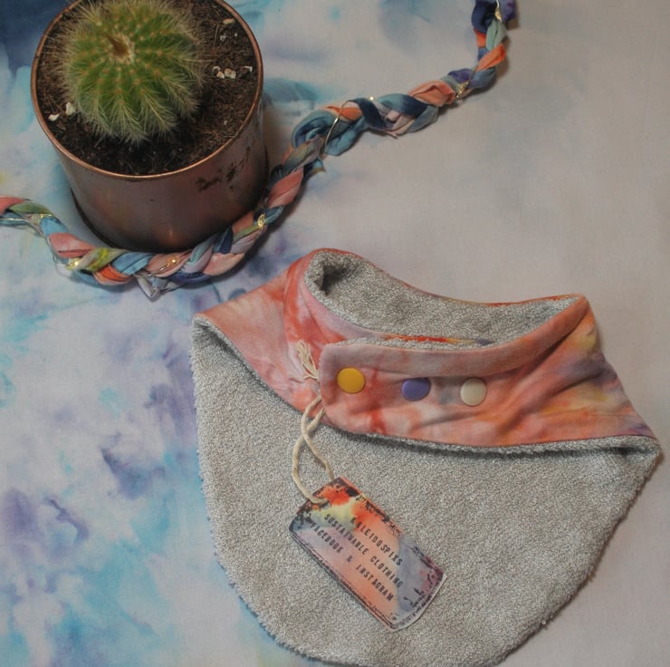 This beautifully patterned and soft Bib is made from Bamboo Jersey and Bamboo Terry Towelling. These materials are super soft, absorbant and much more eco friendly than cotton. The pattern has been hand ice-dyed and has the added advantage of hiding dribble stains incredibly well - take it from a Mum who knows! The rounded shape allows for more coverage - brilliant for teething...