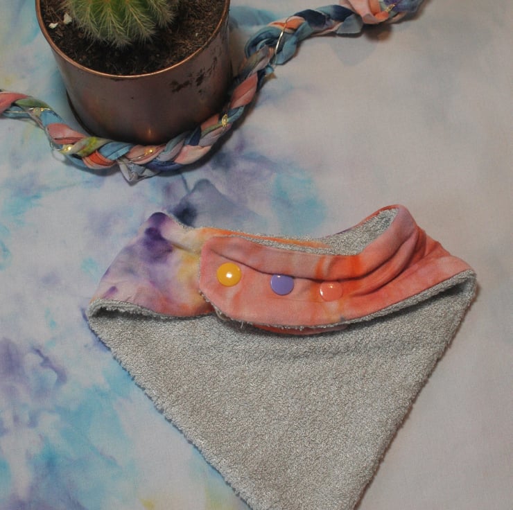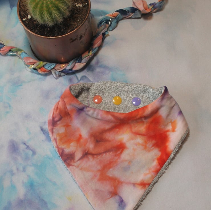 This beautifully patterned and soft cowboy-style Bib is made from Bamboo Jersey and Bamboo Terry Towelling. These materials are super soft, absorbant and much more eco friendly than cotton. Five poppers allows you to adjust the size from Tiny to Toddler. The pattern has been hand ice-dyed and has the added advantage of hiding dribble stains incredibly well - take it from a Mum who knows!