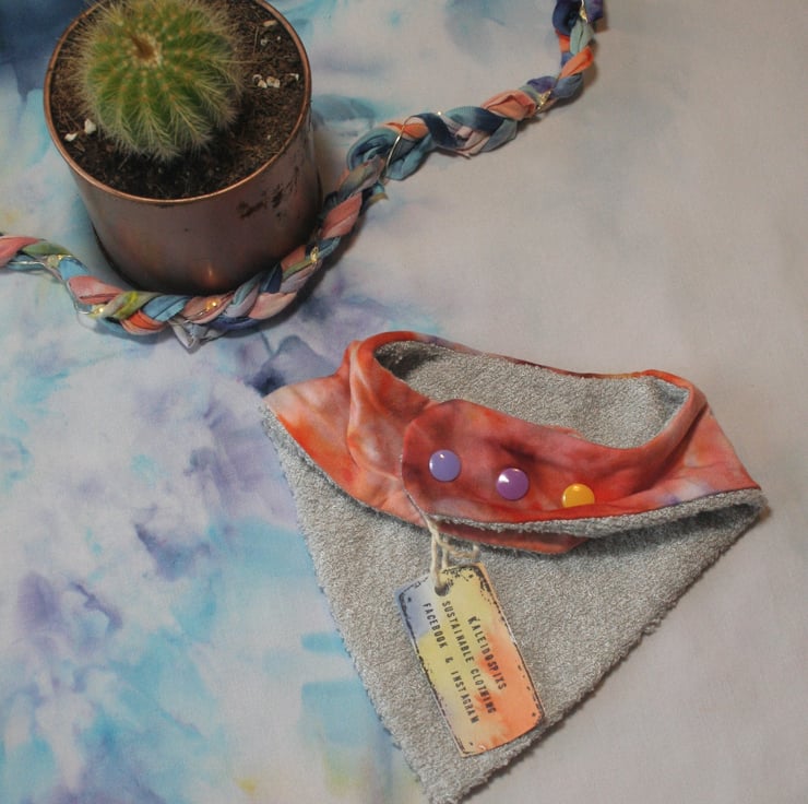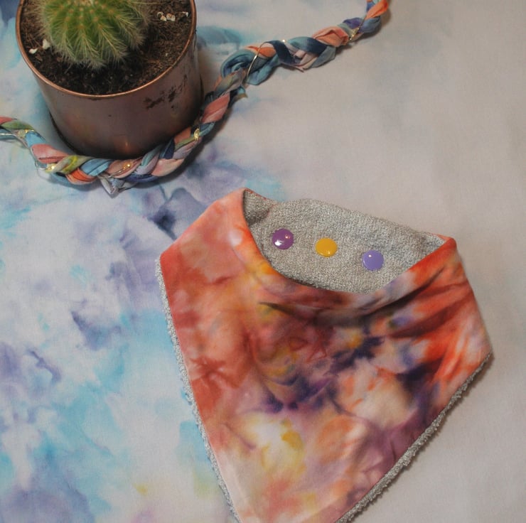 This beautifully patterned and soft cowboy-style Bib is made from Bamboo Jersey and Bamboo Terry Towelling. These materials are super soft, absorbant and much more eco friendly than cotton. Five poppers allows you to adjust the size from Tiny to Toddler. The pattern has been hand ice-dyed and has the added advantage of hiding dribble stains incredibly well - take it from a Mum who knows!