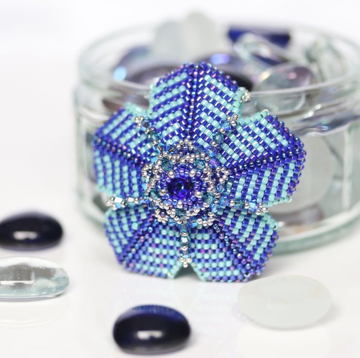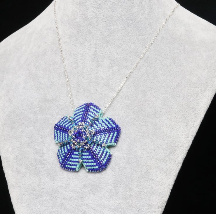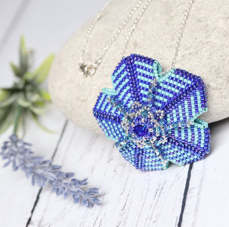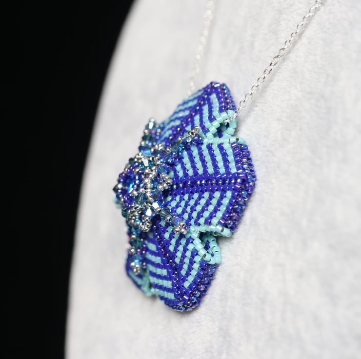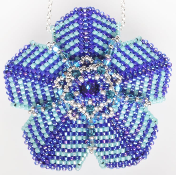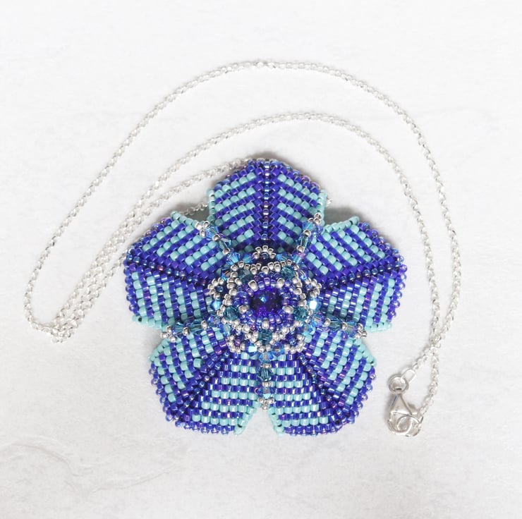 This striking pendant in dark blue and turquoise is in the shape of a flower with a centre piece of a pretty matching Swarovski crystal chaton. It would make a lovely gift for someone special who likes fairly bold pieces of jewellery. Tiny Swarovski bicone crystals (Xilions) in turquoise and teal embellish the piece and add sparkle. The pendant hangs from a sterling silver trace chain with matching trigger clasp which is threaded through the top ‘petal’.