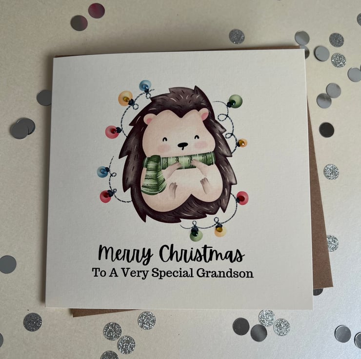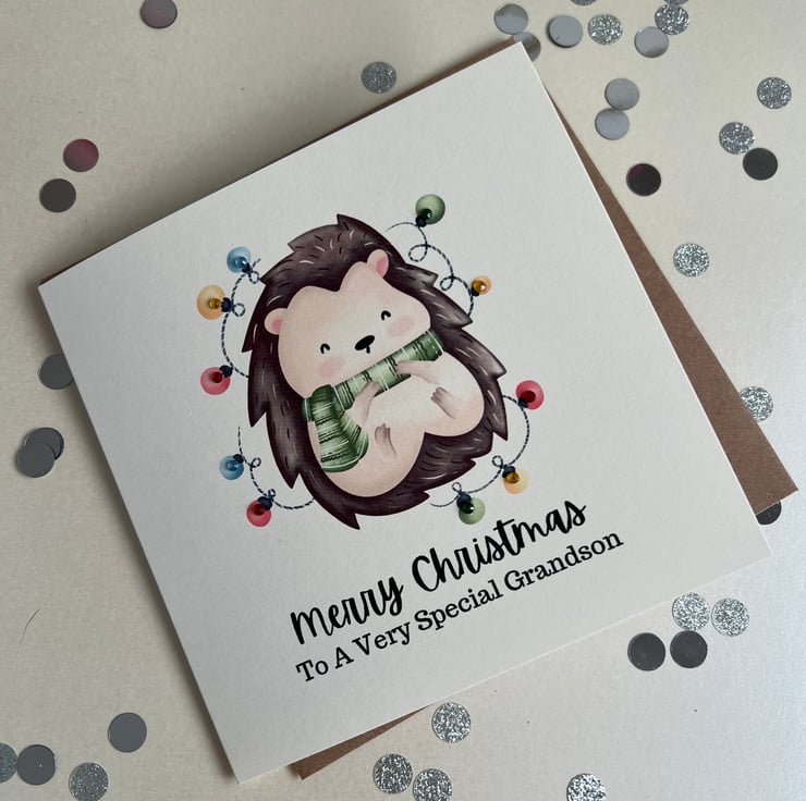 Hedgehog wrapped in Christmas lights. Printed on quality card with gem embellished fairy lights. Message on front of card merry Christmas to a very special grandson