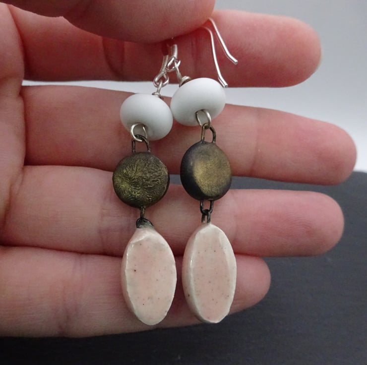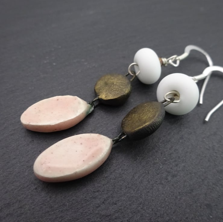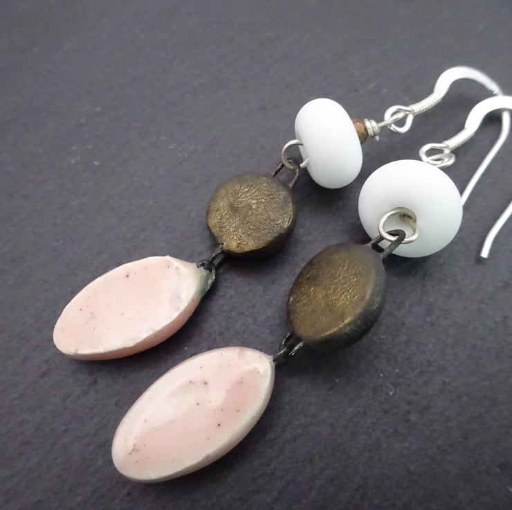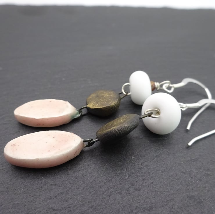 A pair of earrings made with sterling silver ear wires, handmade lampwork glass beads and handmade ceramic drops.