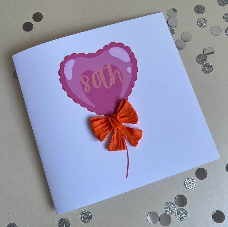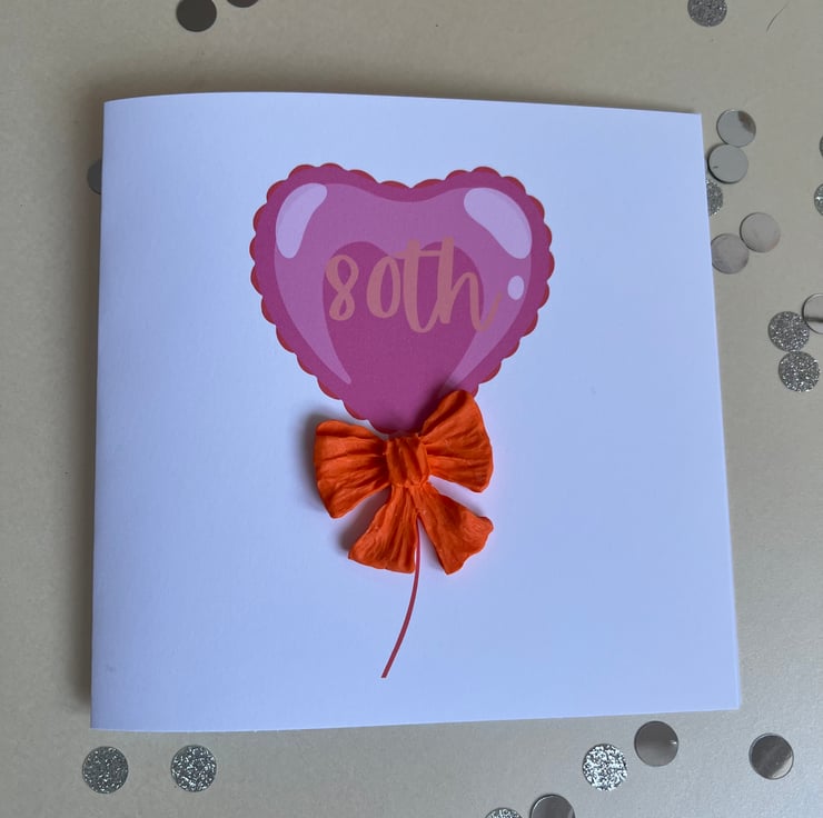 Pink heart shaped balloon with 80th printed in balloon embellished with large orange polymer bow.