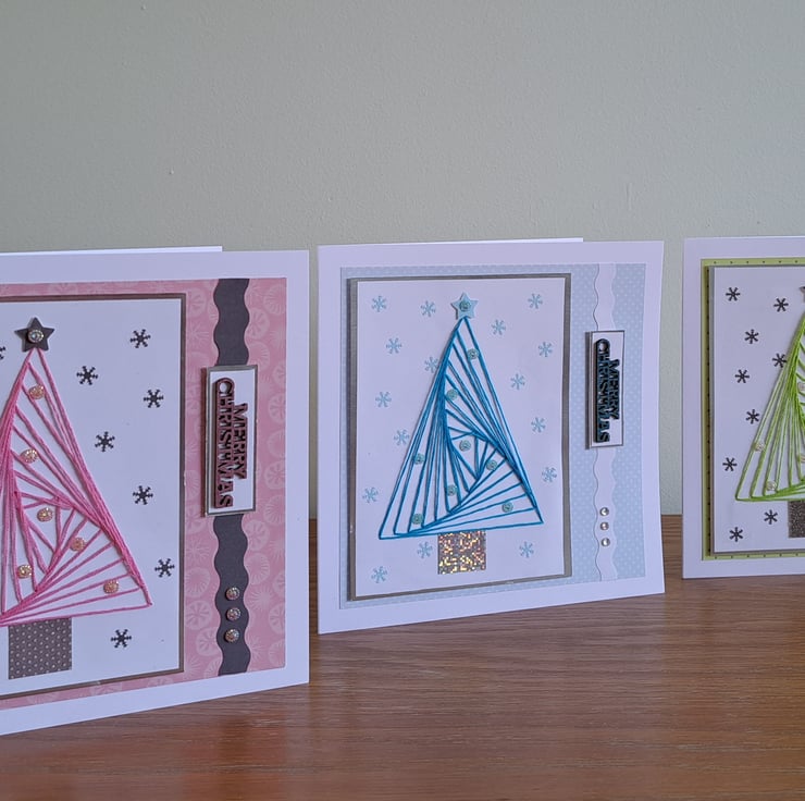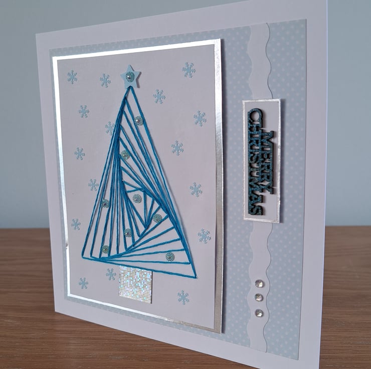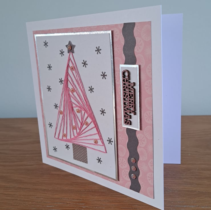 Elegant hand sewn Christmas tree adhered to a co-ordinating layered card. Embellished with mini snowflakes, sparkly gems and a wooden 'Merry Christmas' greeting. A clean, modern design available in 3 colours: pale pink, pale blue or pale green.