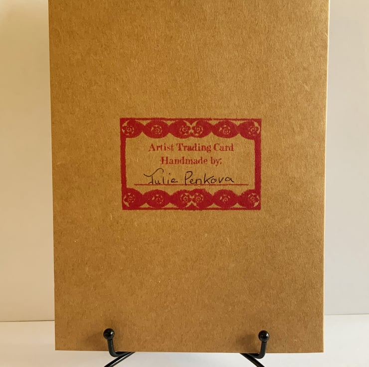 Framed with luxury ribbon in gold copper and green. Mounted on an A5 brown card with matching envelope. Sealed in a cello bag.