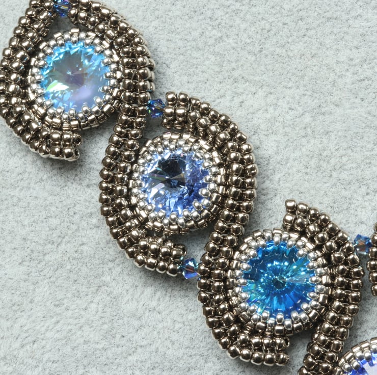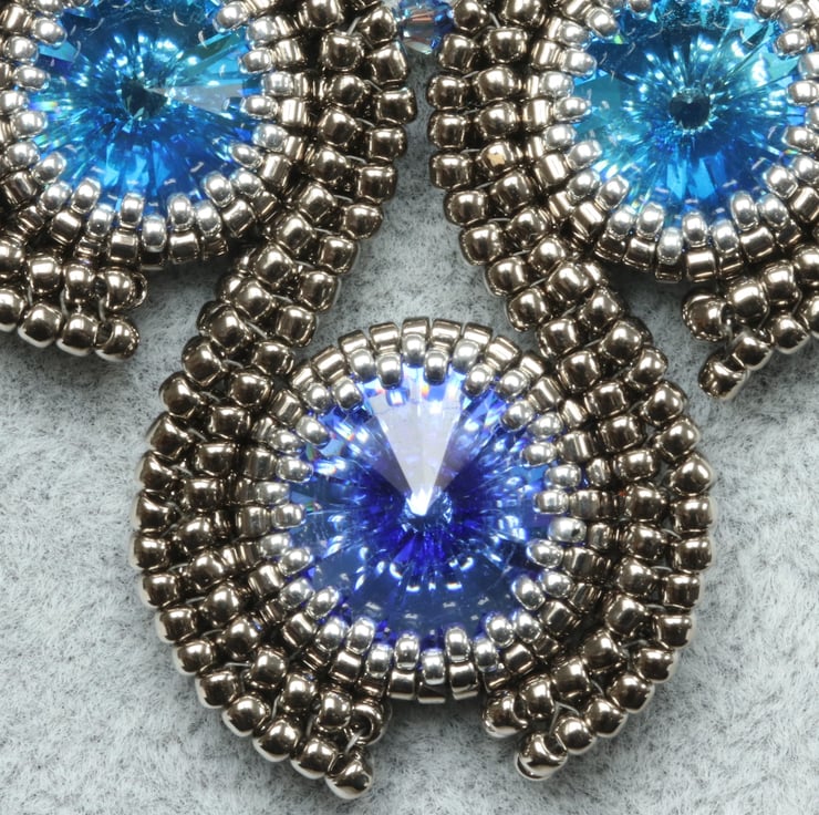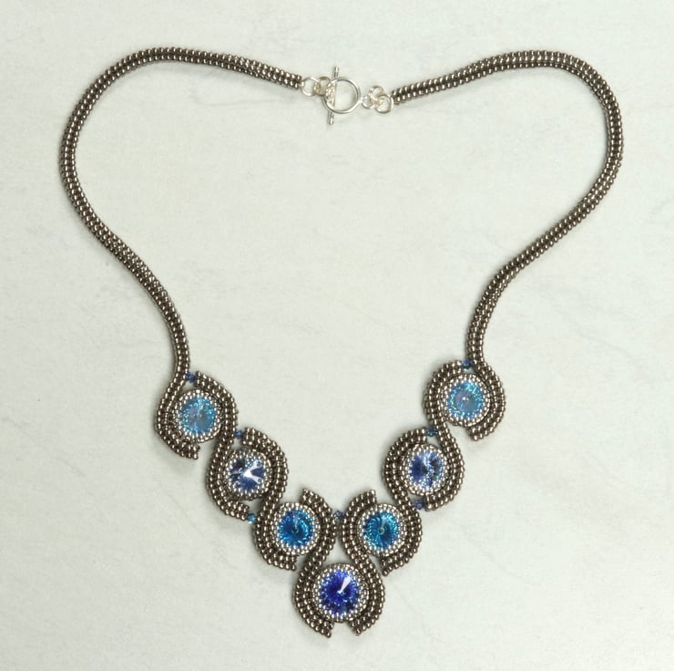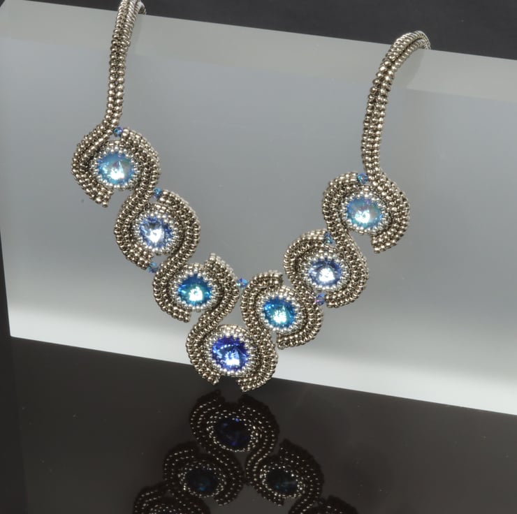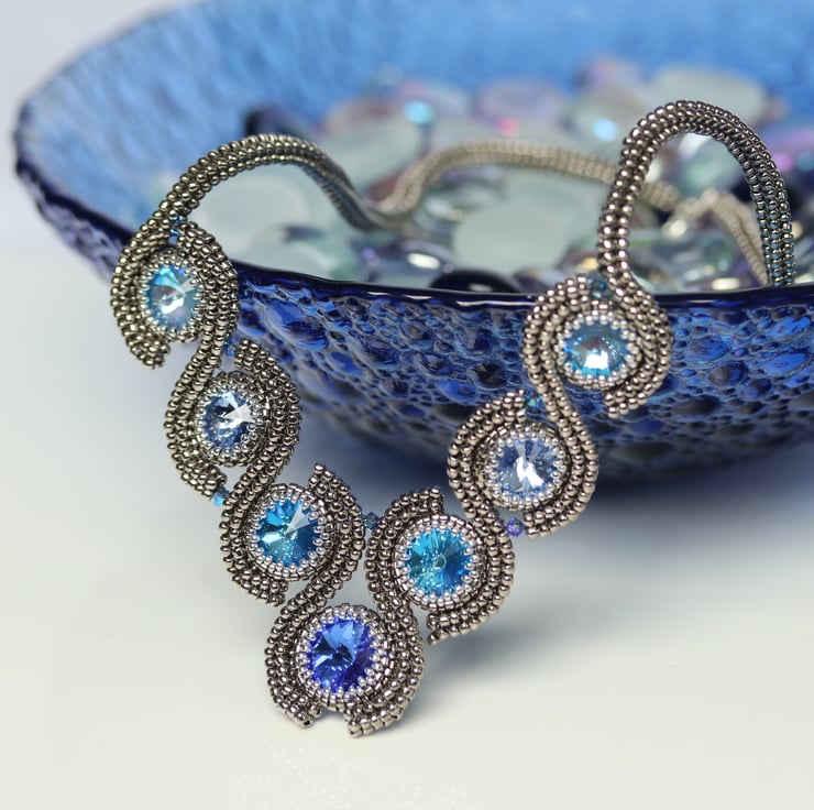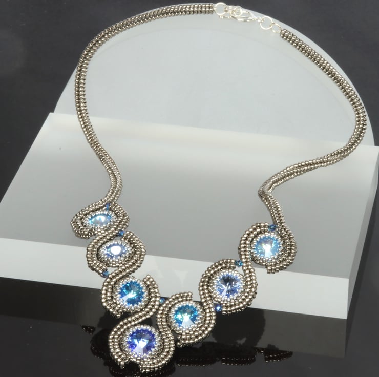 A pretty and unusual necklace in graduated shades of blue, aquamarine and antique (nickel coloured) silver. The blue crystals are Swarovski rivolis in shades of sapphire and capri blue. These have now been withdrawn from sale by Swarovski so this piece is a one-off from me. The Rivolis are surrounded with little nickel coloured glass seed beads and these beads have also been used to make a rope necklace to finish the piece. Tiny (3mm) blue Swarovski crystals sit between the rivolis. A sterling silver toggle clasp completes the necklace.