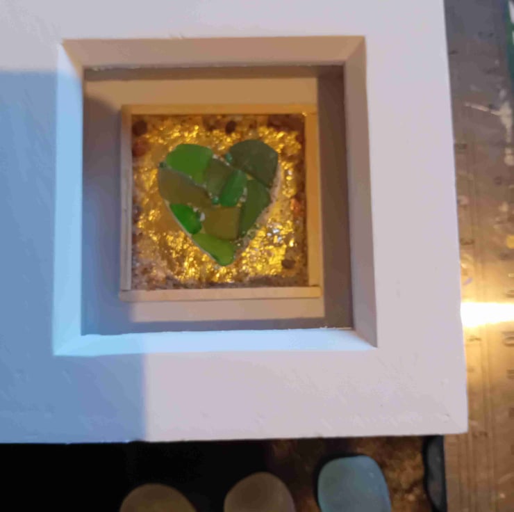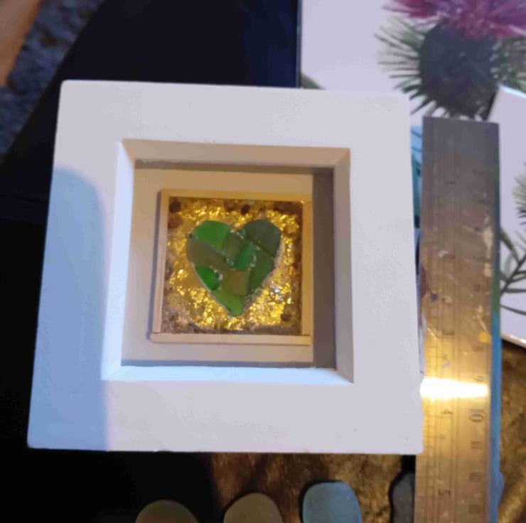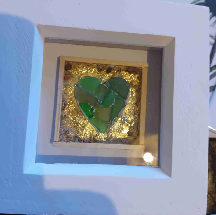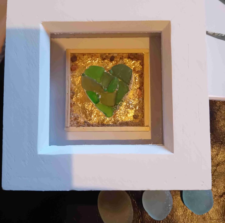 Hand crafted and collected seaglass placed on a wooden heart base seaglass from Highland beaches with gold leaf and sand on a wooden handmade frame sitting inside this beautiful white wood frame