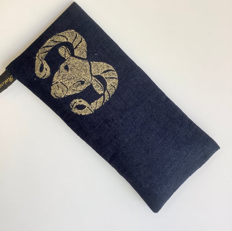 Eye pillow hand printed with an original linocut design using eco friendly inks on to natural 100% naturally-sourced eco-friendly linen