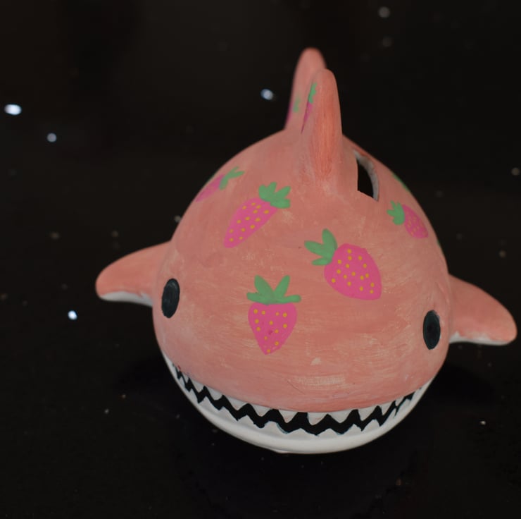 Ceramic Hand-Painted Pink Shark Money Box with Strawberry Design - Free Postage