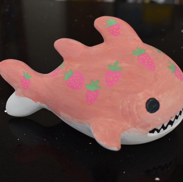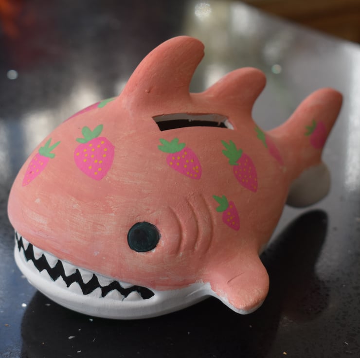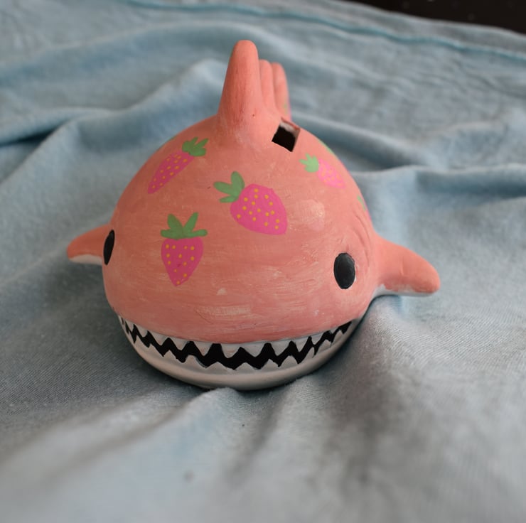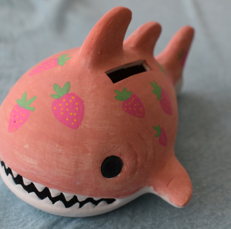 This attractive little shark ocean-themed money box is a super-cute place to store your pennies for a rainy day... This strawberry shark is ceramic and hand painted with a fruity design.