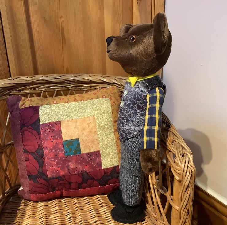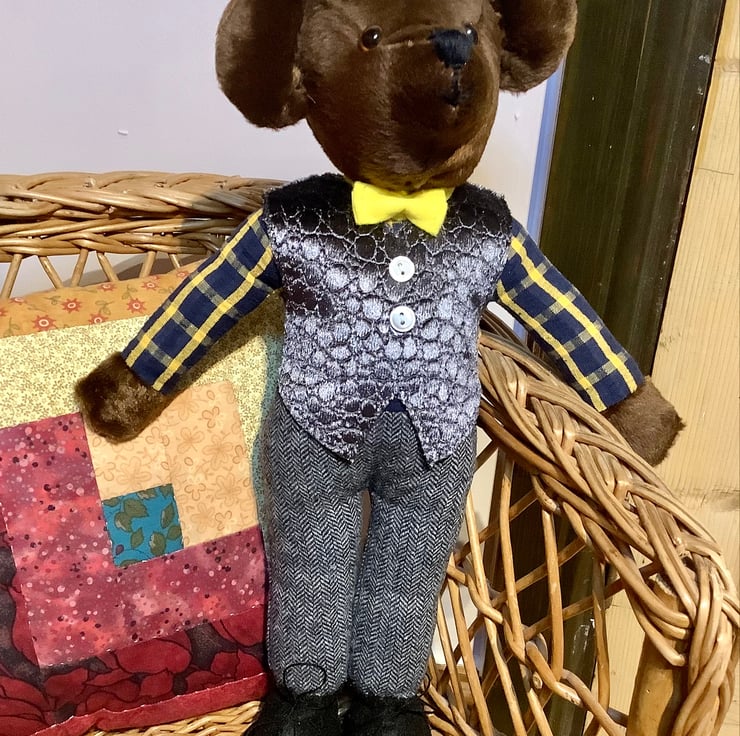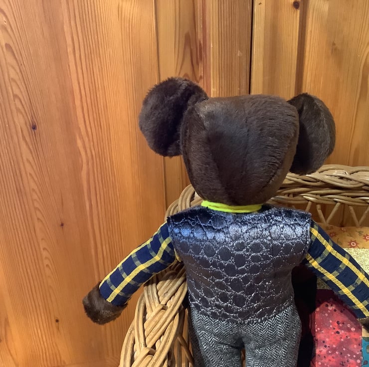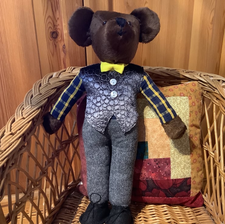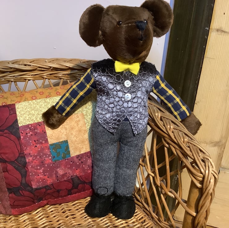 My bear has been cut from an original pattern by Edith Moody, a soft toy maker working in the thirties and forties. I have named him Bertie as he has a smart outfit of grey tweed trousers, yellow and blue check shirt and faux crocodile pattern waistcoat. And I reckon he looks quite smart, for a bear of course.