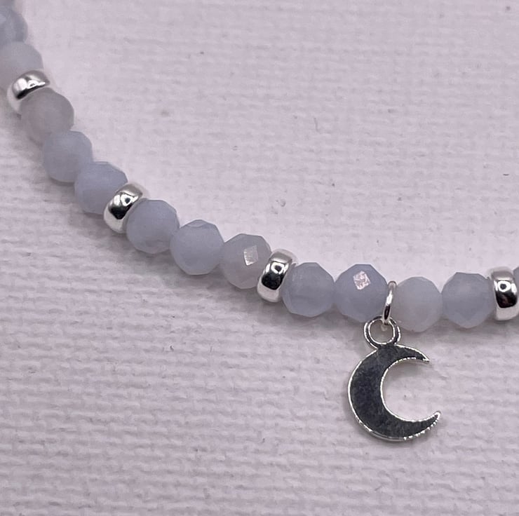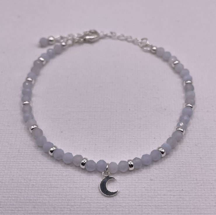 This bracelet is made with high quality chalcedony gemstones - each stone is 3.5mm - and a sterling silver crescent moon shaped charm. Supplied from Turkey, the gemstones has a very slight tinge of blue and are beautifully cut for lots of sparkle. Includes 12 sterling rondelles beads. Bracelet is finished off with a charm at the end made of a chalcedony bead and a sterling silver bead. Adjustable bracelet with a total length of 210mm.