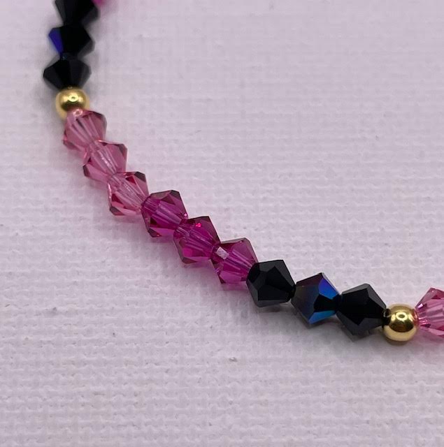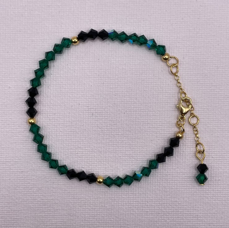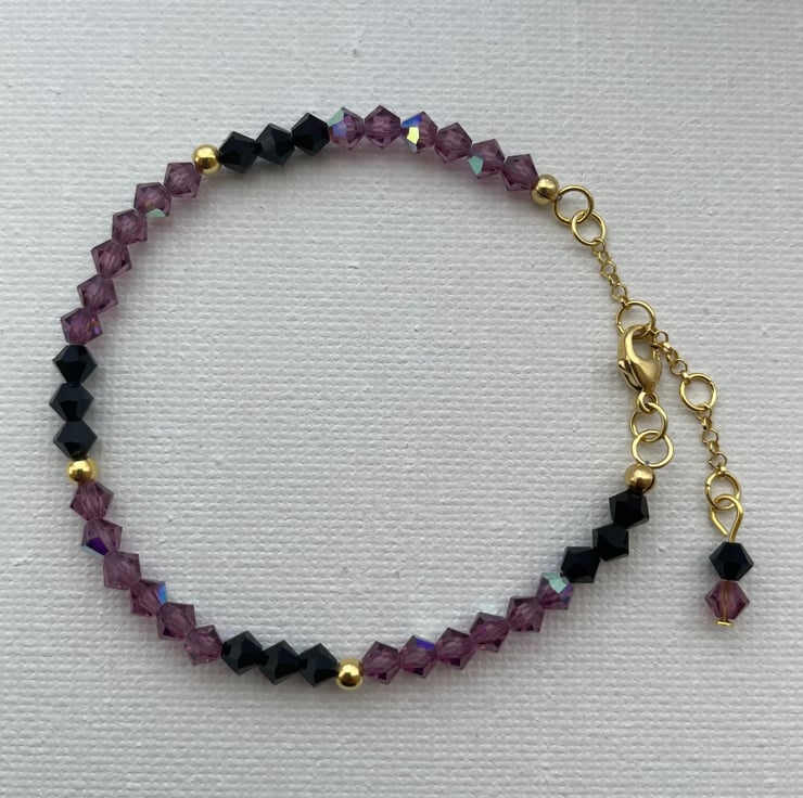 This bracelet is made with 4mm bicone crystals and gold vermeil (sterling silver coated with 24K gold). Adjustable bracelet length at 165mm, 175mm and 185mm. Total bracelet length is 210mm. It is finished off with a charm at the end with 2 crystal beads. Available in 3 colours, so choose which one/s you'd like: