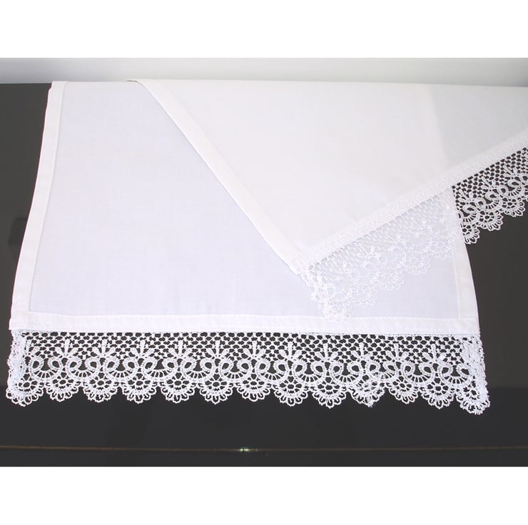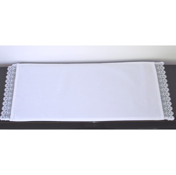 This cloth measures approx 90cm x 35cm (36" x 14") and has a 6cm Scrolls and Scallops lace trim at the shorter ends (included in the measurements).