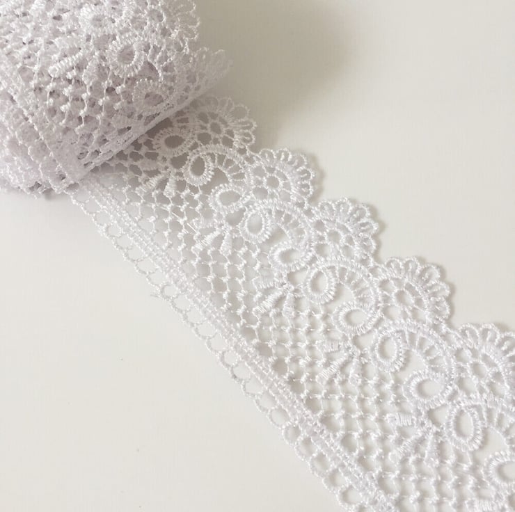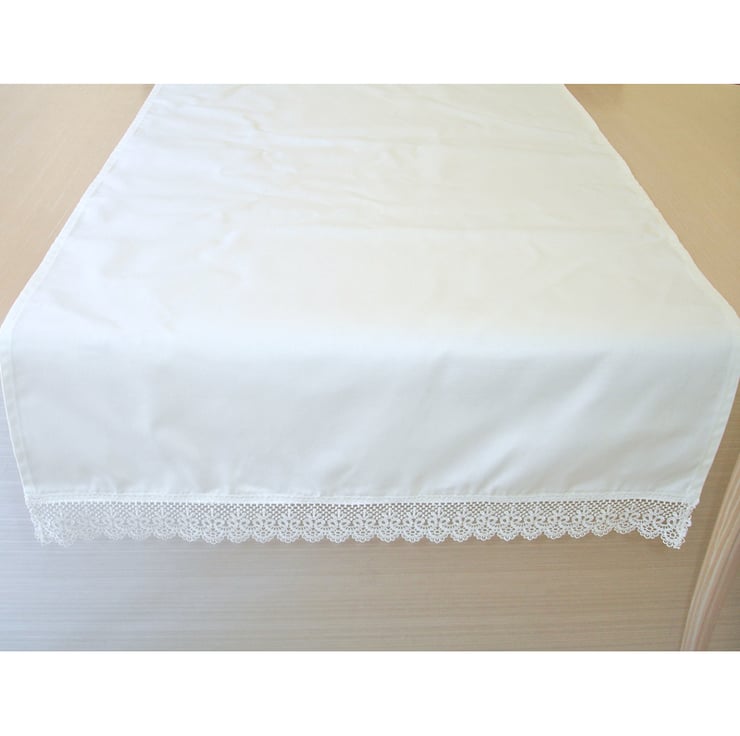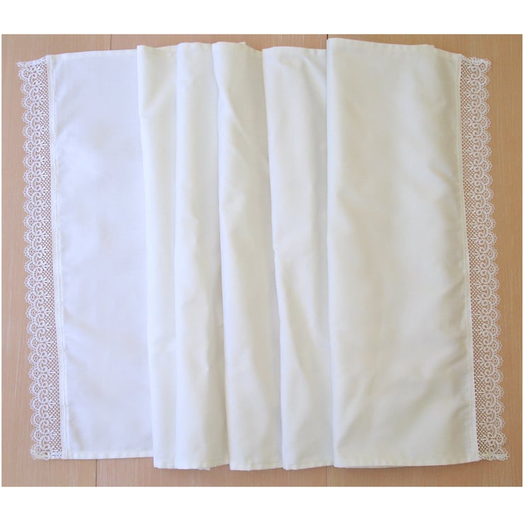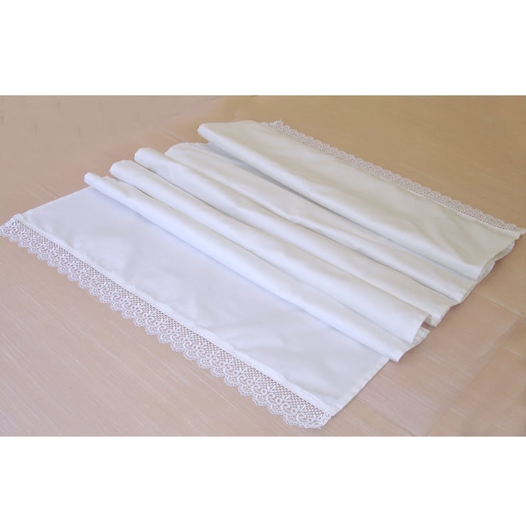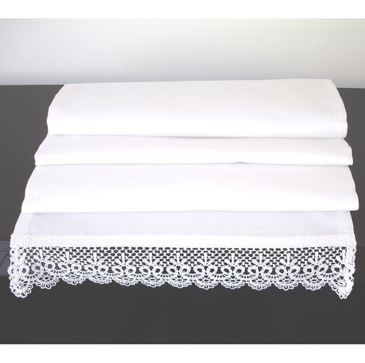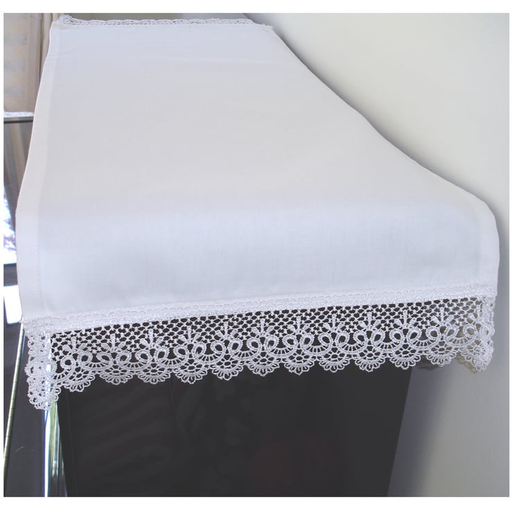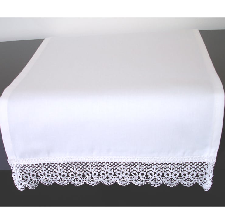 This cloth measures approx 150cm x 35cm (60" x 14") and has a 6cm Scrolls and Scallops lace trim at the shorter ends (included in the measurements).