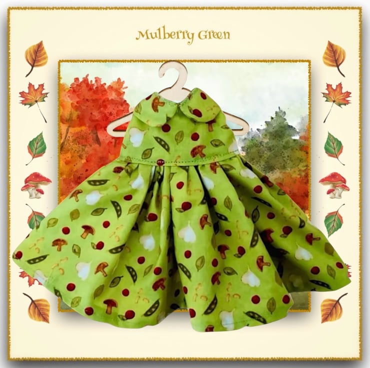 A cute little dress in a foraging design to fit the Mulberry Green characters. The dress is made from best quality cotton and has a full skirt and a lined bodice. It goes well with the embroidered red cardigan and shoes.