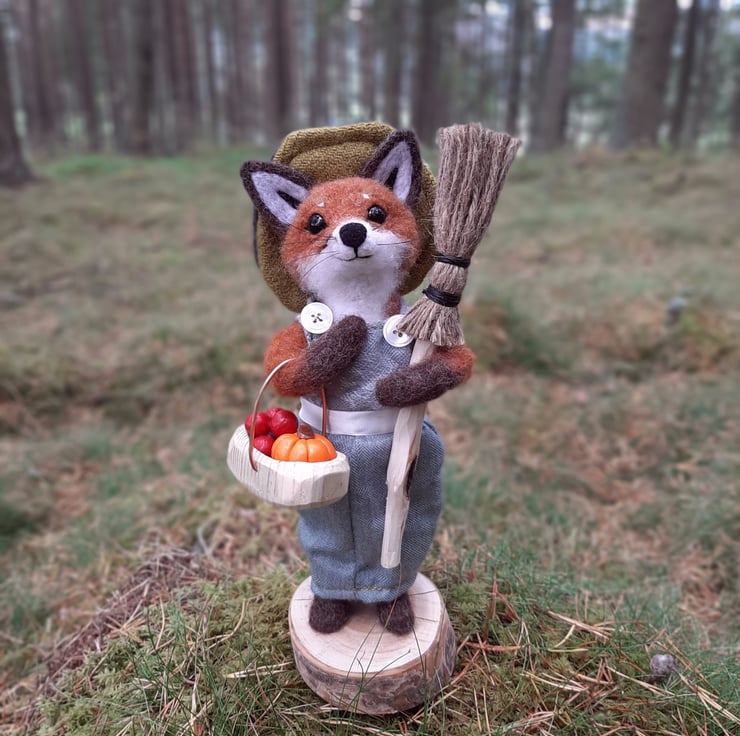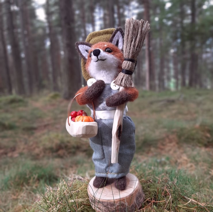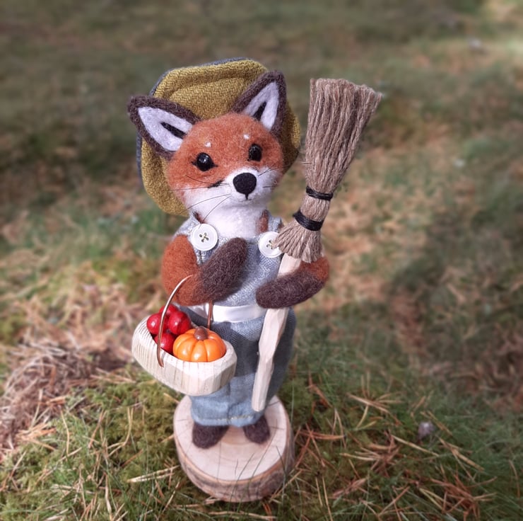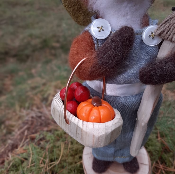 This piece is a hand crafted needle felt sculpture, measuring approx 30cm tall. Made from hand felted wool, and featuring black glass eyes and real horsehair whiskers. Her dress and hat are sewn on a vintage singer sewing machine, and made using upcycled fabrics and tweed.