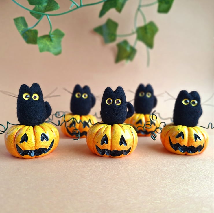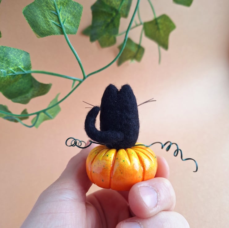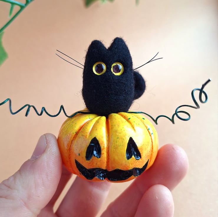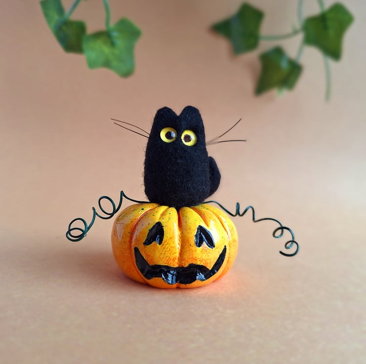The cat is made from black felted wool, and features hand coloured glass eyes. The Pumpkin is hand painted and varnished, and has twisted wire vines.