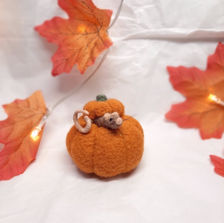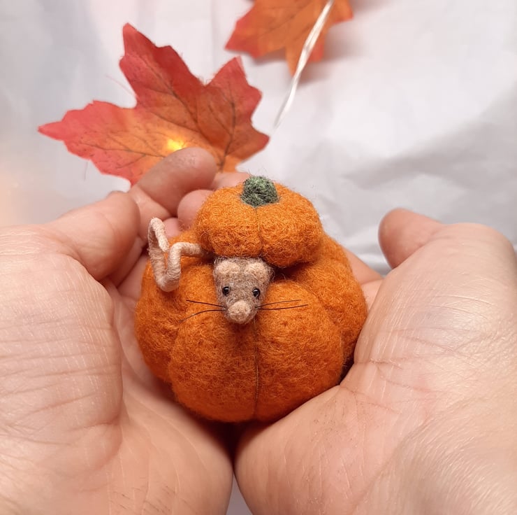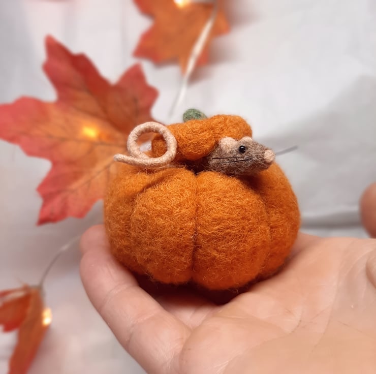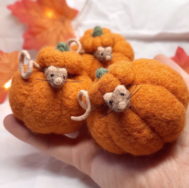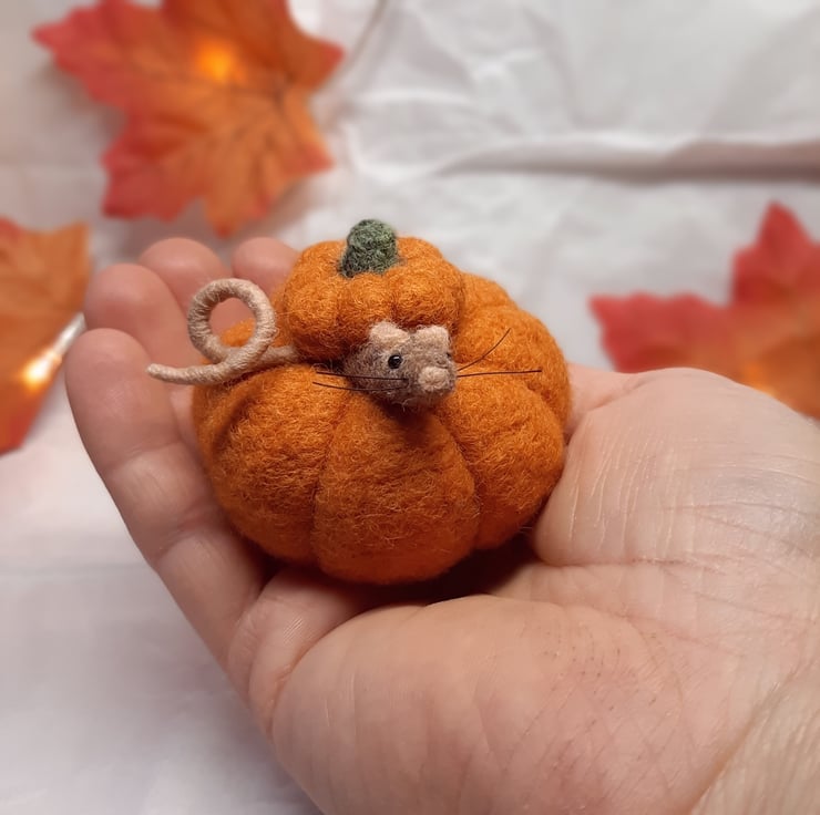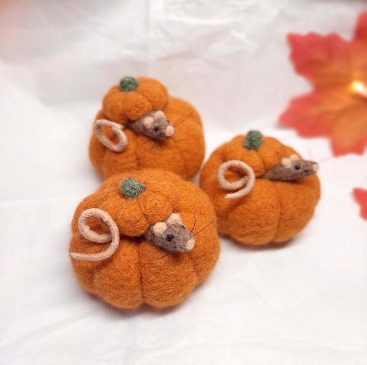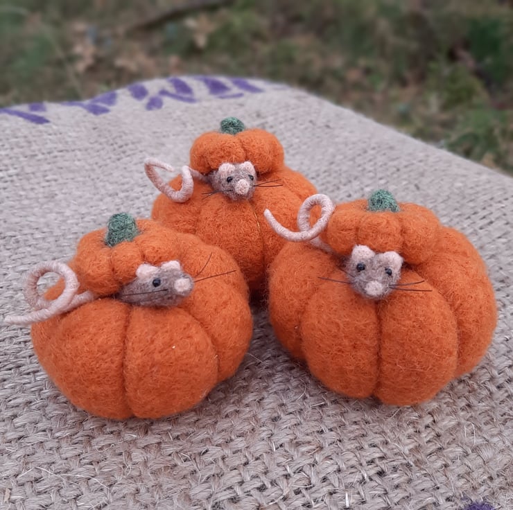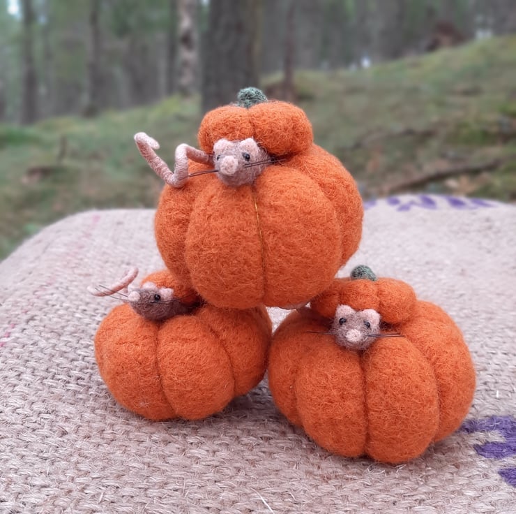 These little Pumpkins are hand felted from soft carded wool, and have dinky wool mice peeking from inside. Each mouse has micro glass eyes, real horse hair whiskers and a curly wire tail.