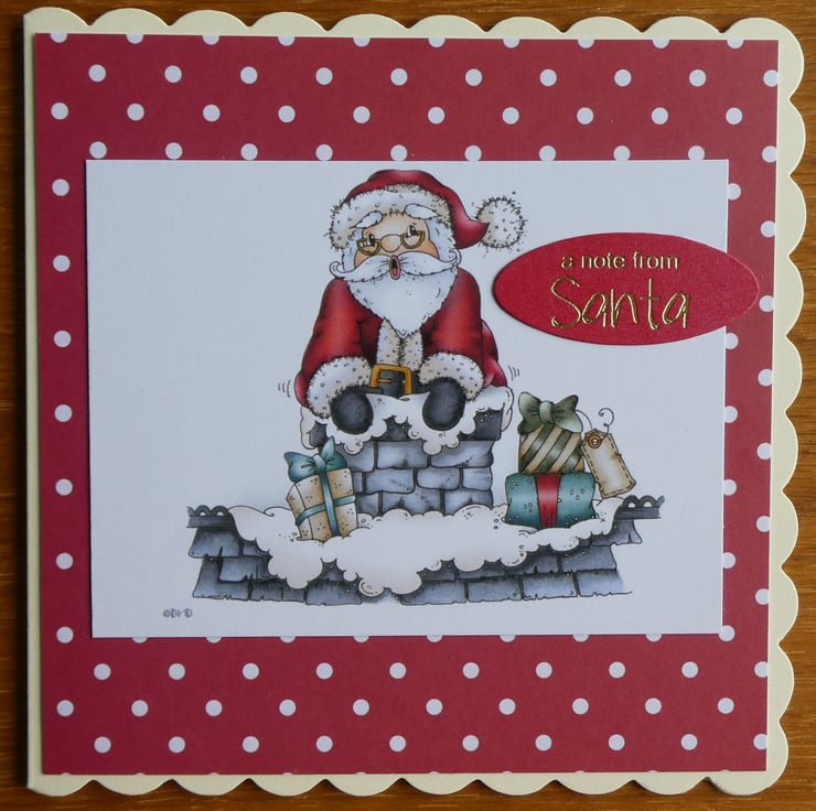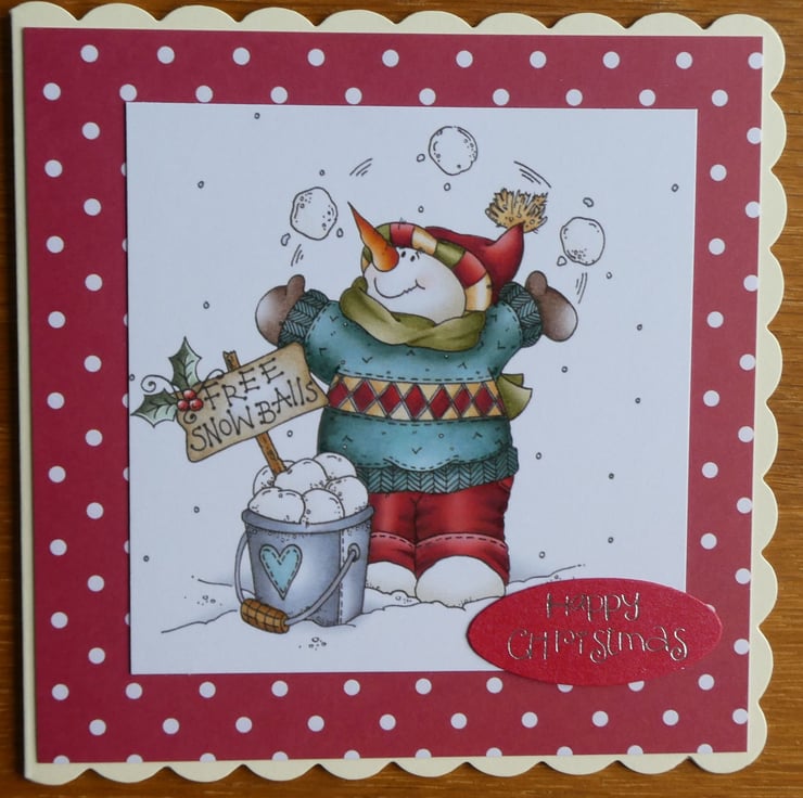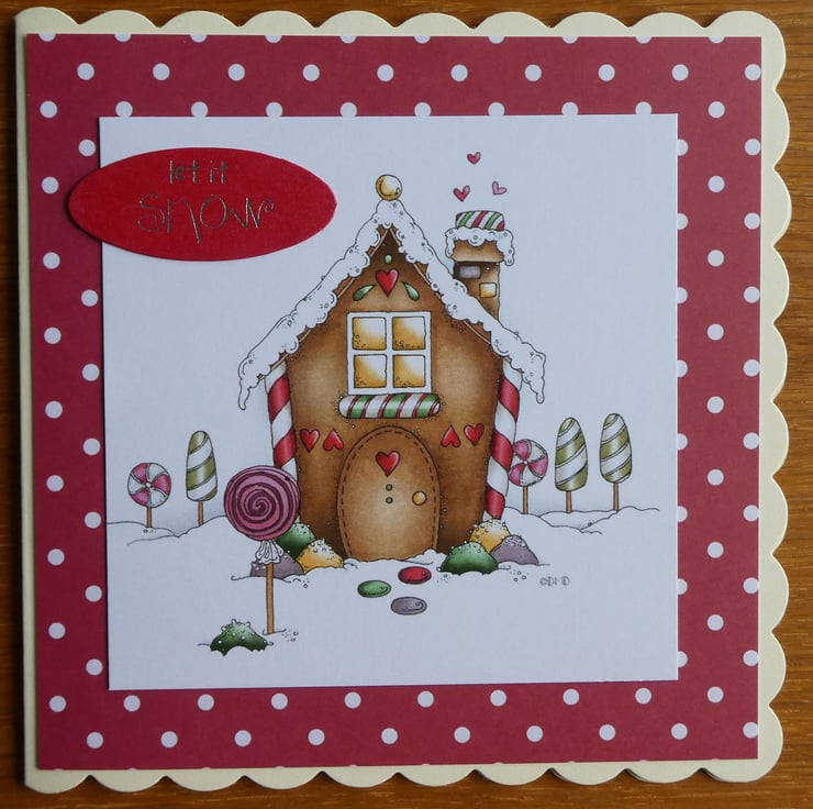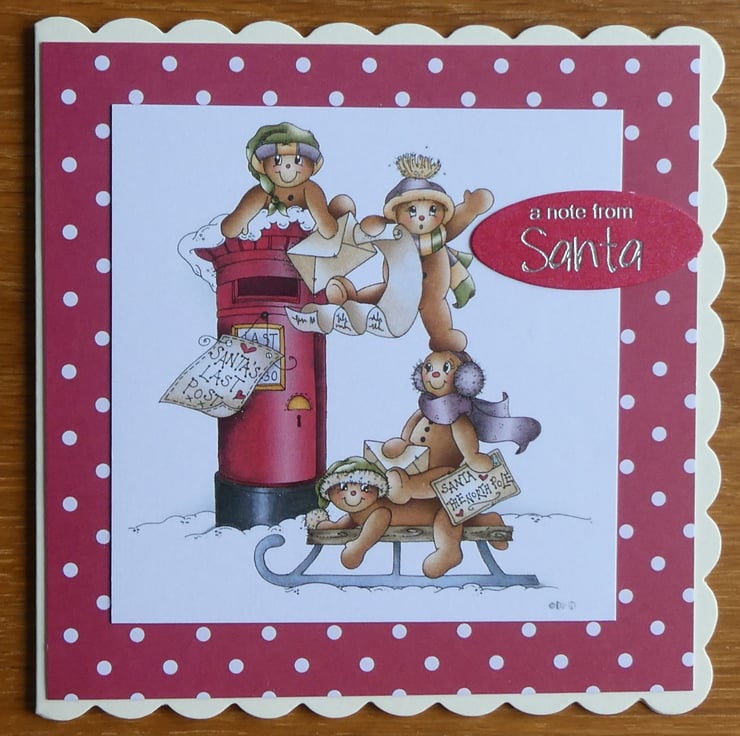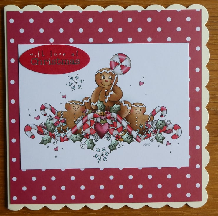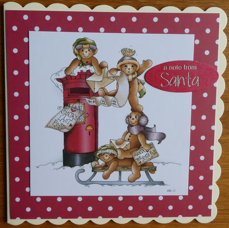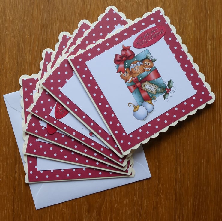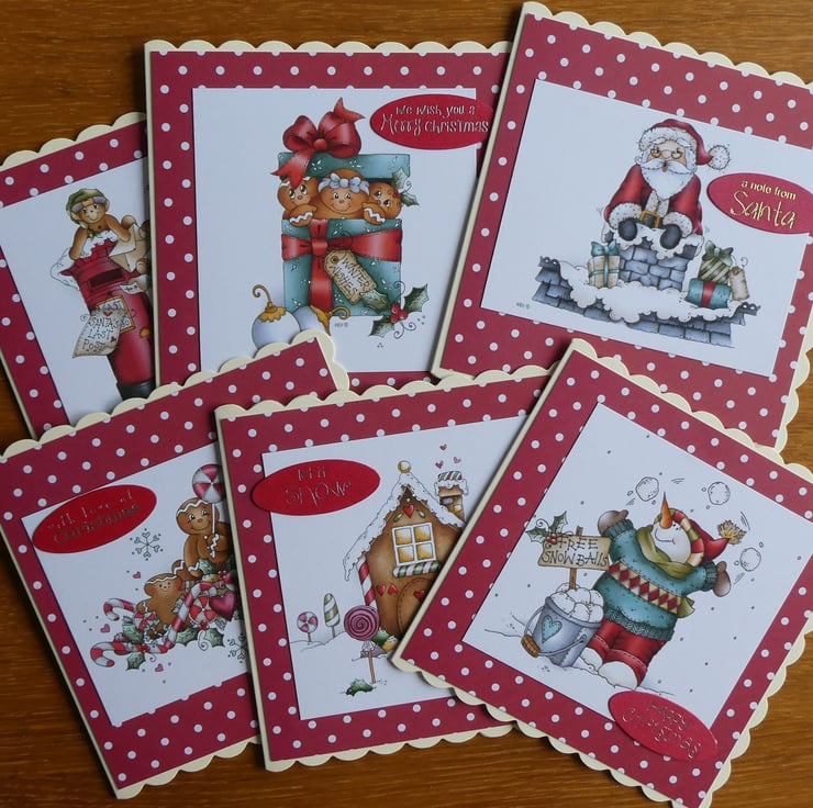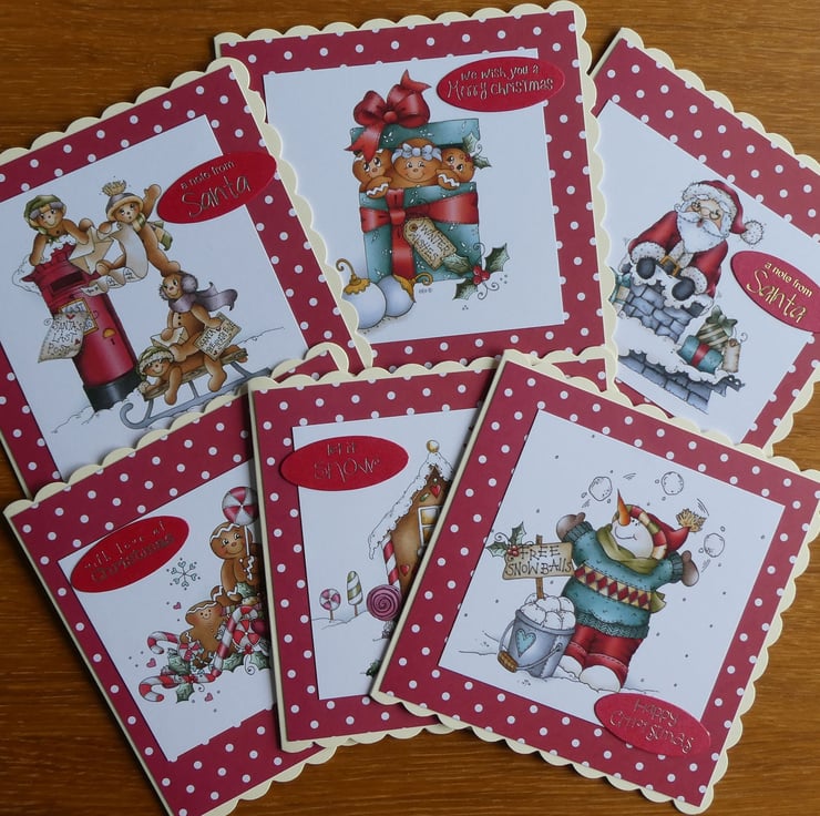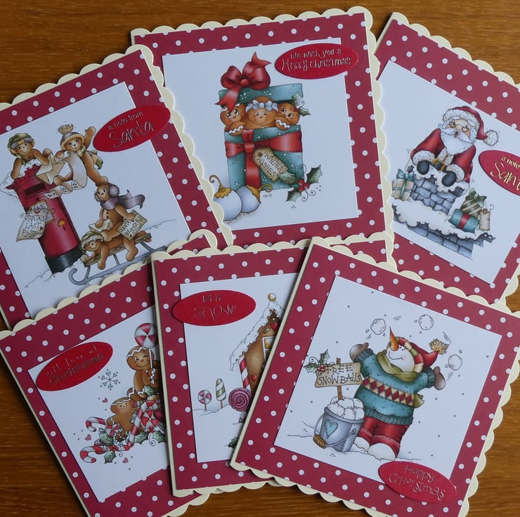 The cute images are all printed onto quality card and have been mounted onto a red and white polka dot card and then onto cream scalloped edge cards approximately 12cm square.