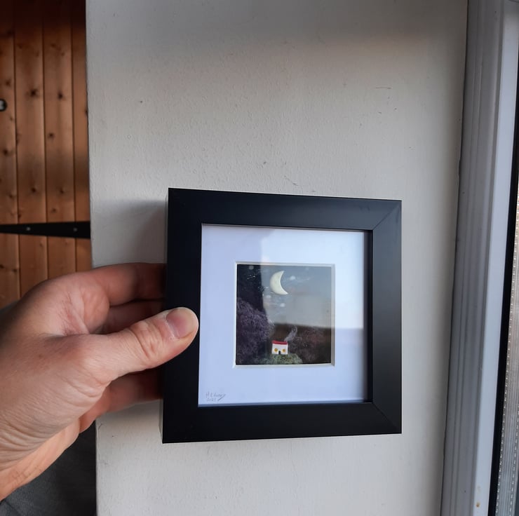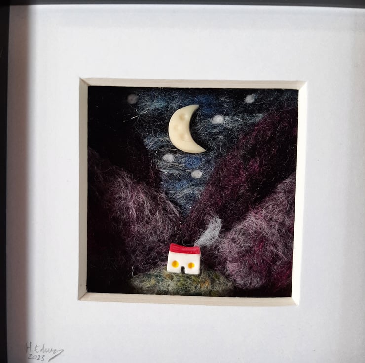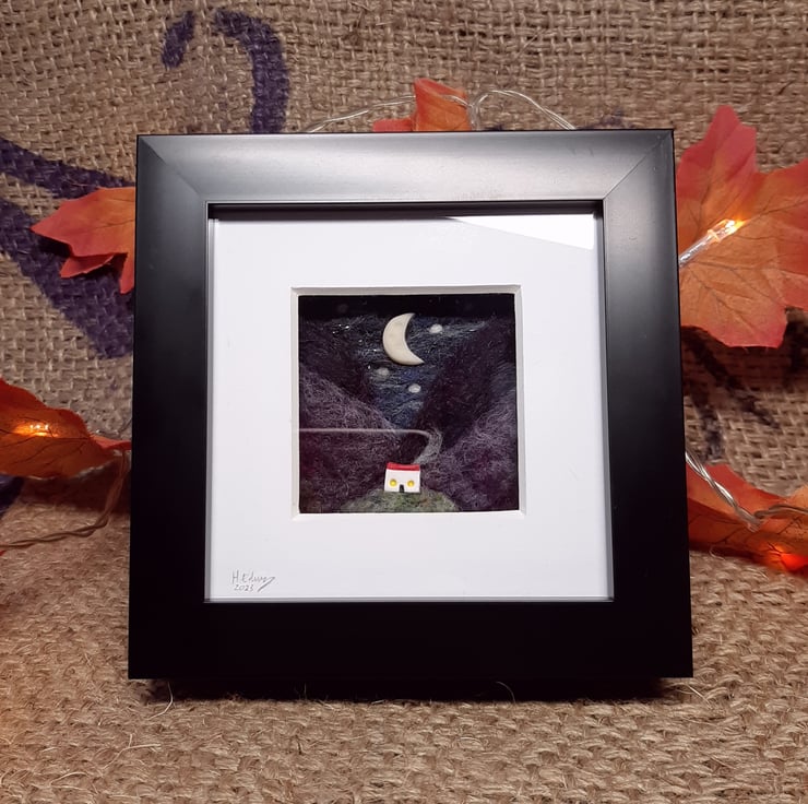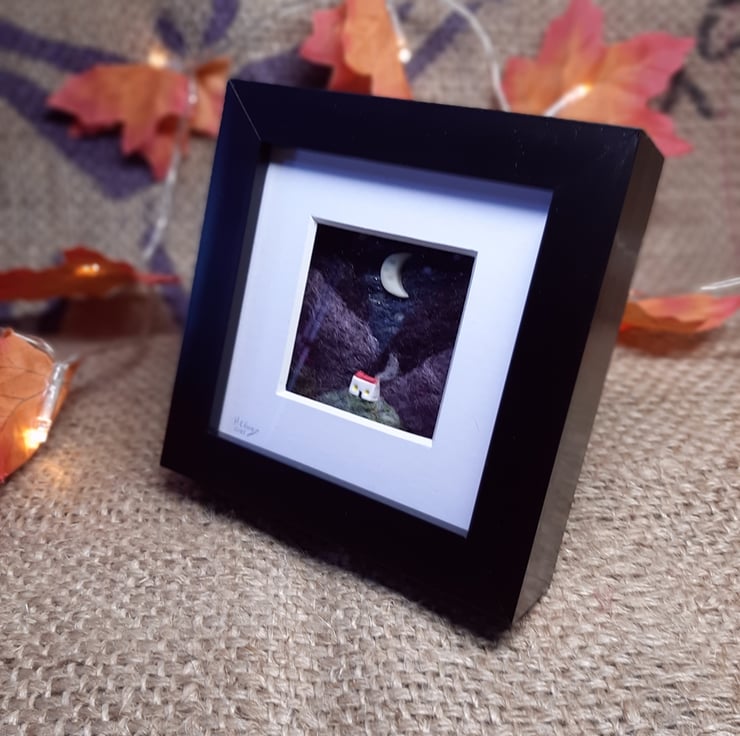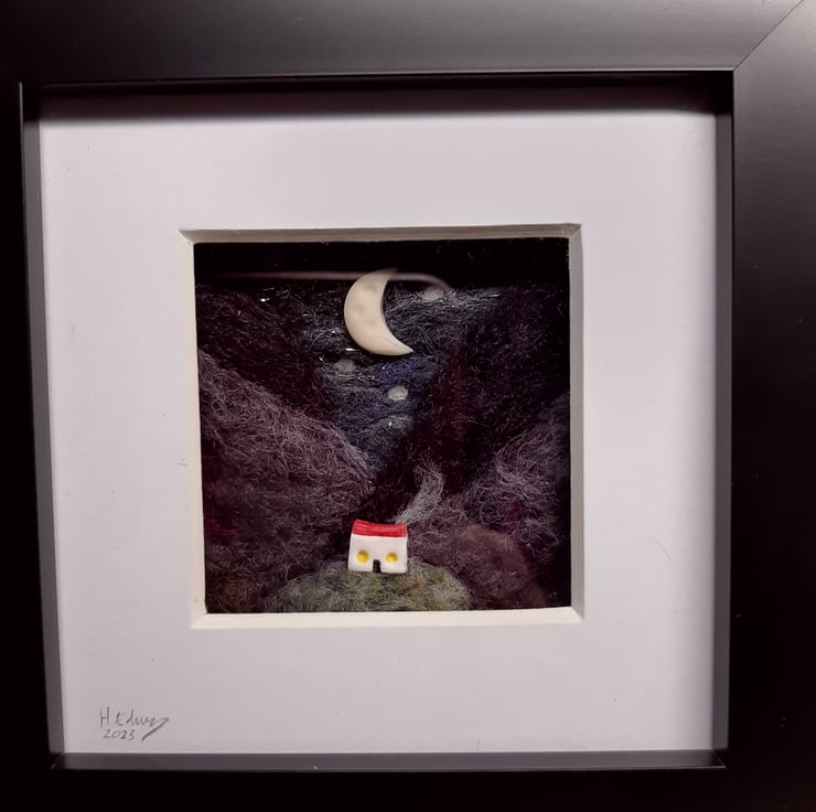 This piece features rolling Scottish hills, inspired by my wanderings around my remote highland home! A miniature polymer clay bothy sits in the foreground, while a tiny glow in the dark moon hovers in the sky.
