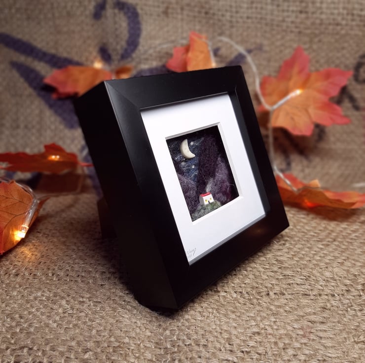 A tiny felted landscape, tucked into a miniature 3D box frame, and signed by the artist.