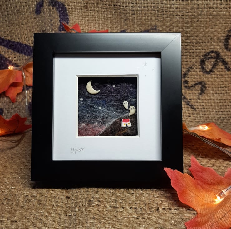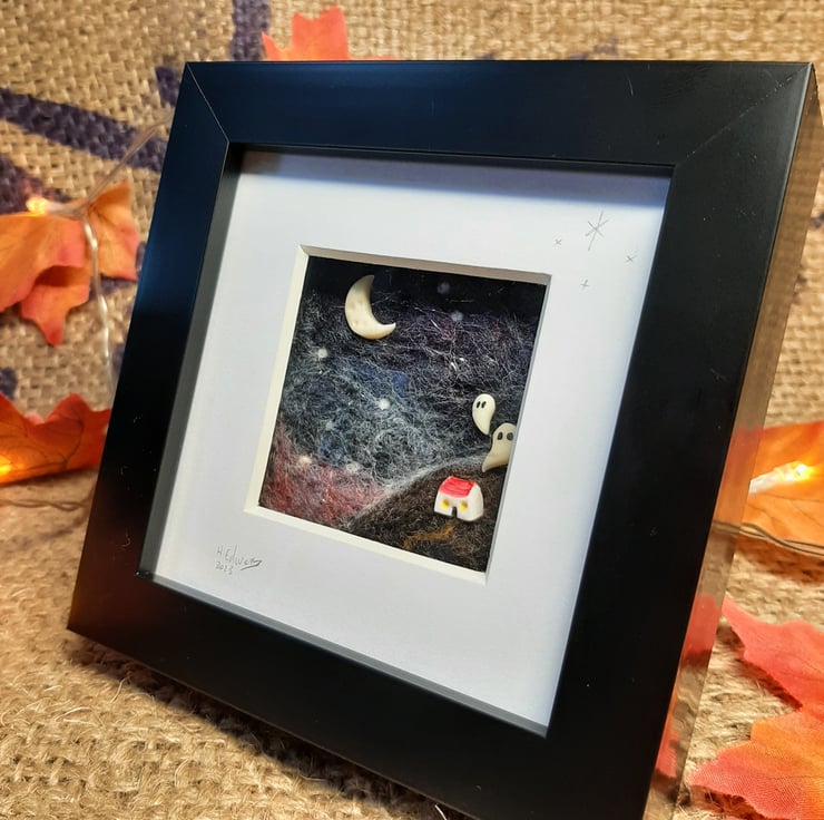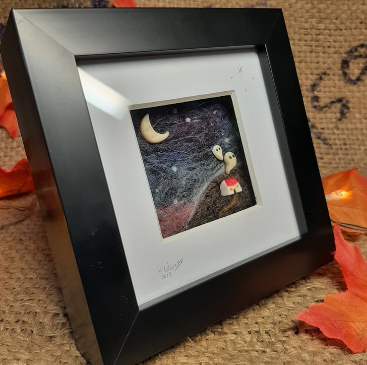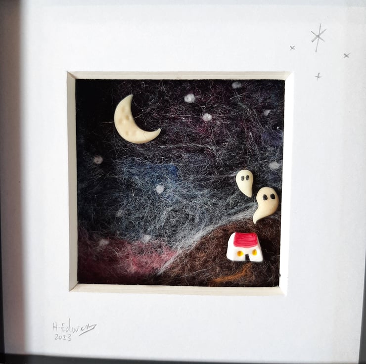 This piece is inspired by my wanderings around my remote highland home! A miniature polymer clay bothy sits in the foreground, while a tiny glow in the dark moon and ghosties hover in the sky.