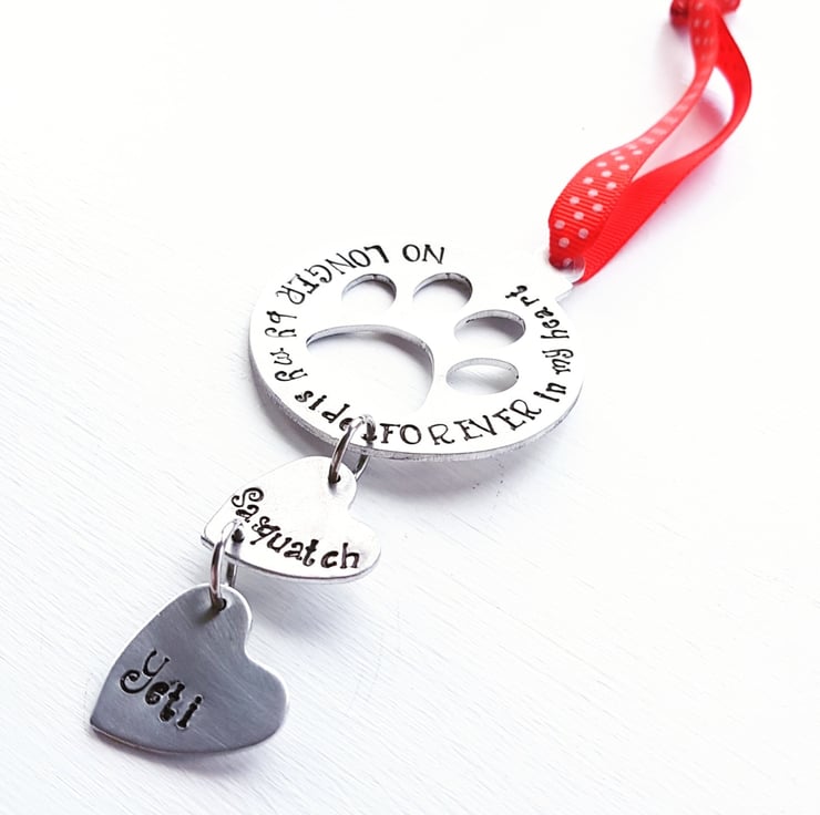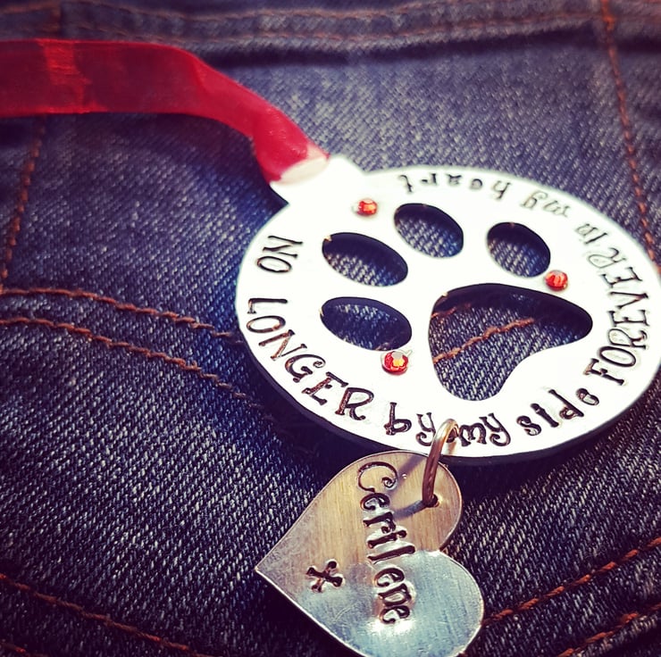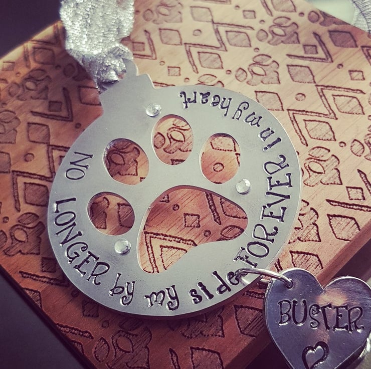 Hamdstanped tree ornament, stamped onto an aluminium blank. Metal stamping uses special tools and no machinery. Each letter is stamped individually. Words can be changed to suit your needs. Add a note with your choice of ribbon. Anything possible.