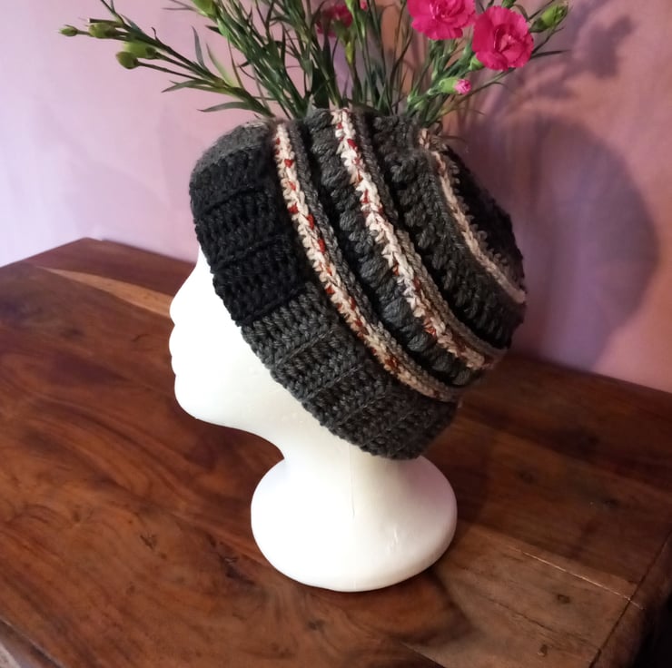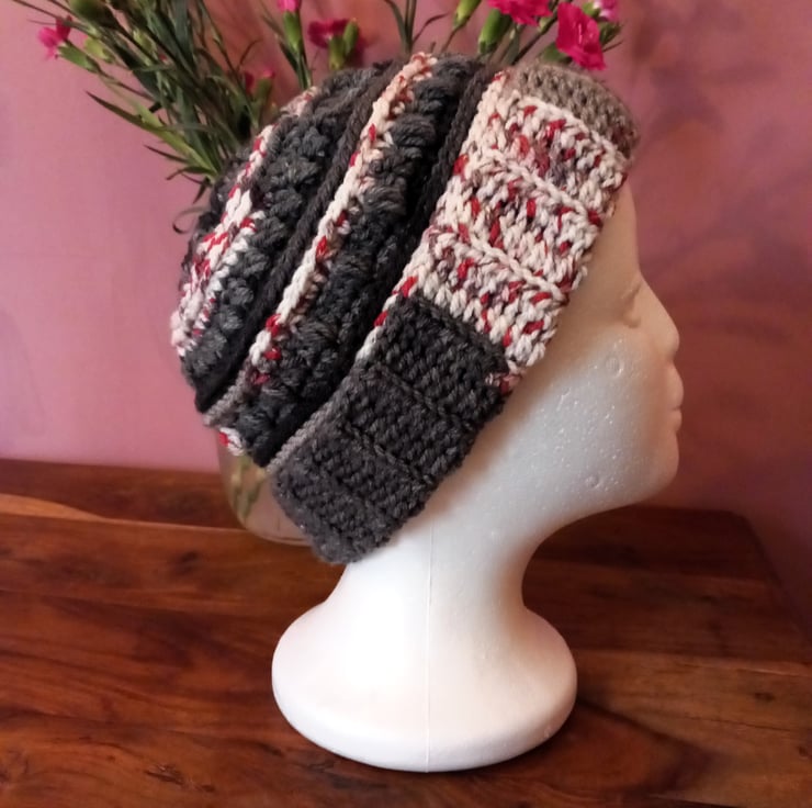 Introducing our handmade Winter Beanie, a cozy essential crafted with care from aran weight, color-changing yarn that seamlessly blends grey, black, and red shades. This beanie isn't just an accessory; it's a warm hug for your head, thanks to the textured crochet stitches puff and twisted doucble crochet that create a wonderful, cosy texture. Plus, we've added a ribbed section for that perfect, stay-put fit.