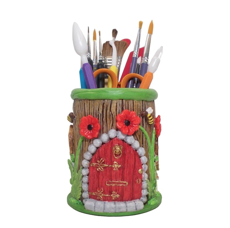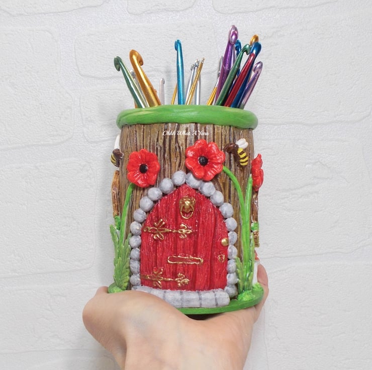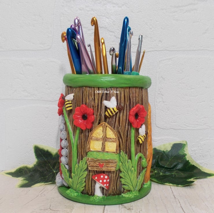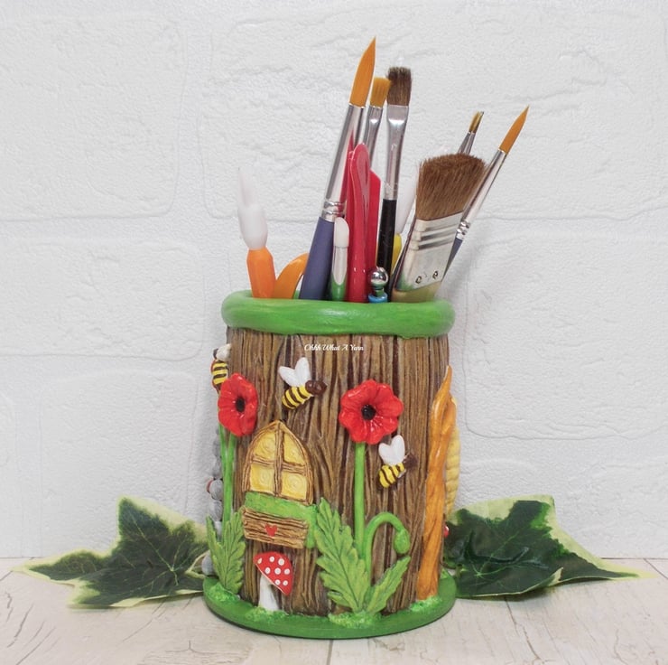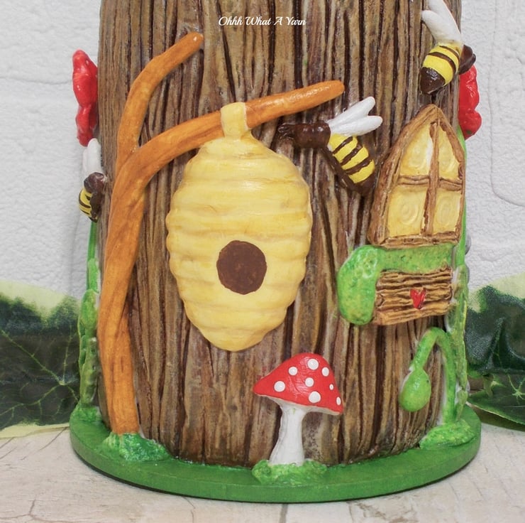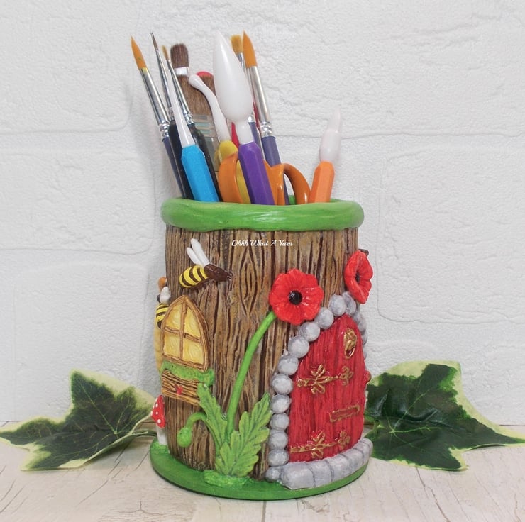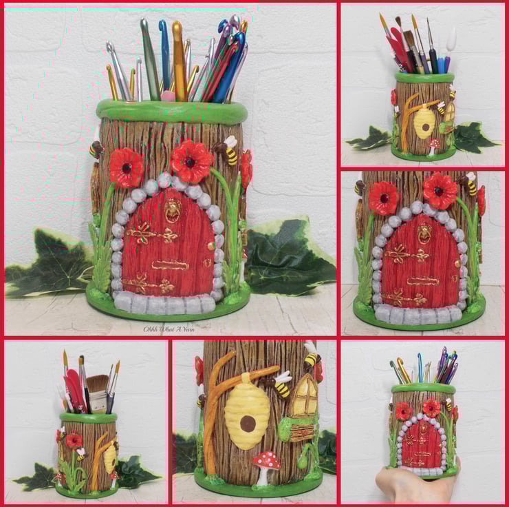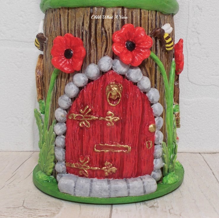 I have decorated the pot with a red fairy door and windows. I have added gorgeous red poppies, leaves, vines, a hanging beehive and lots of little bees and toadstools. I have given the pot a wood grain effect and it is painted using acrylic paints.
