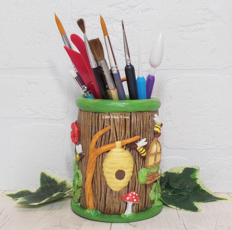 This useful and pretty pot has been created using airdry clay and acrylic paints.