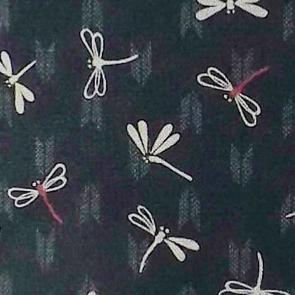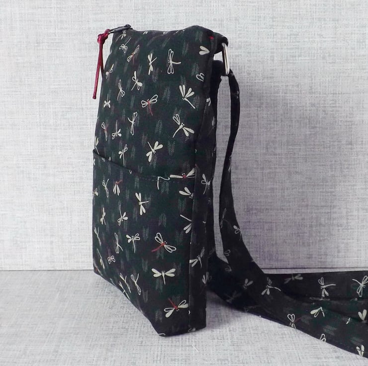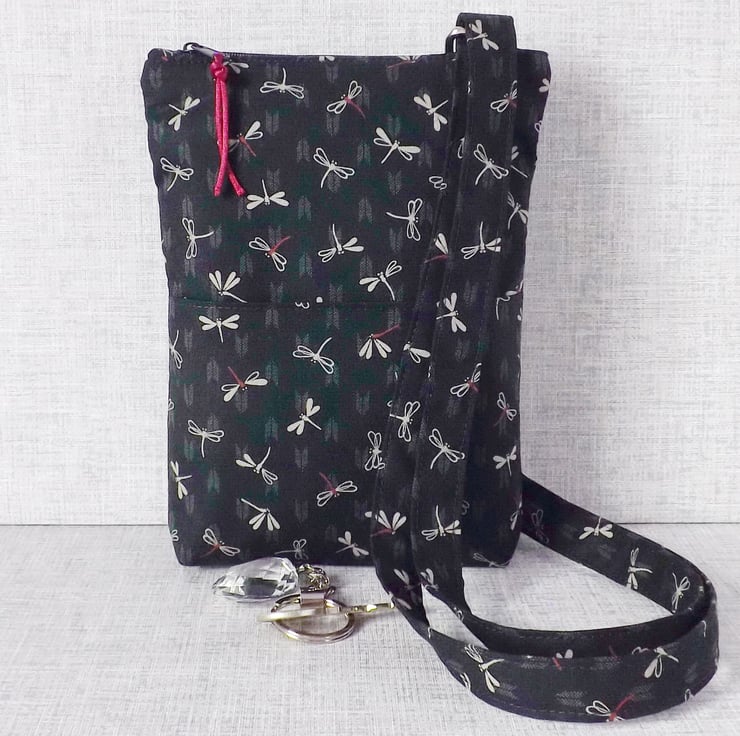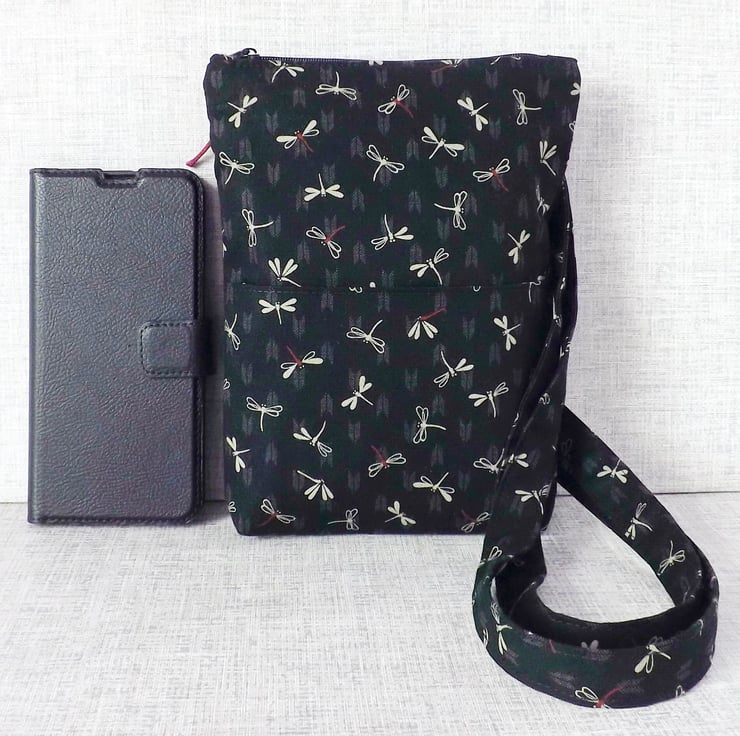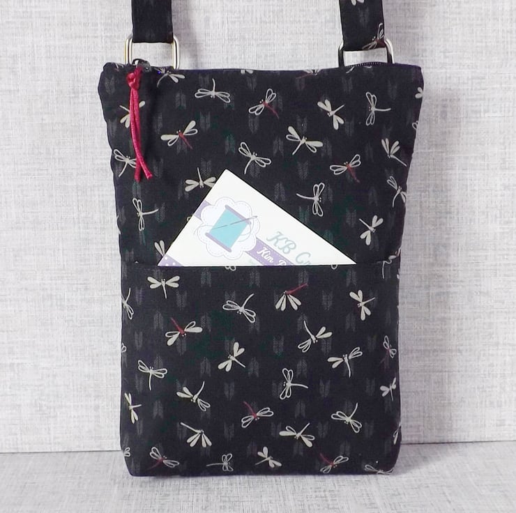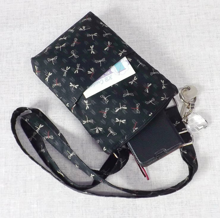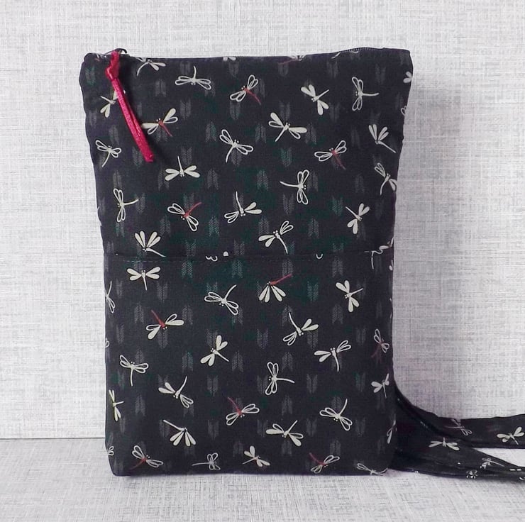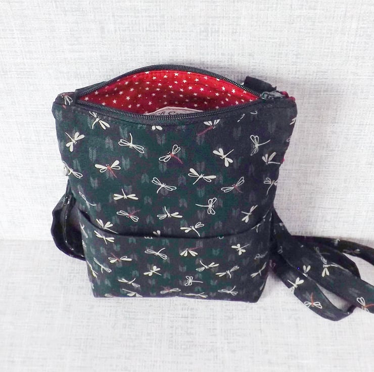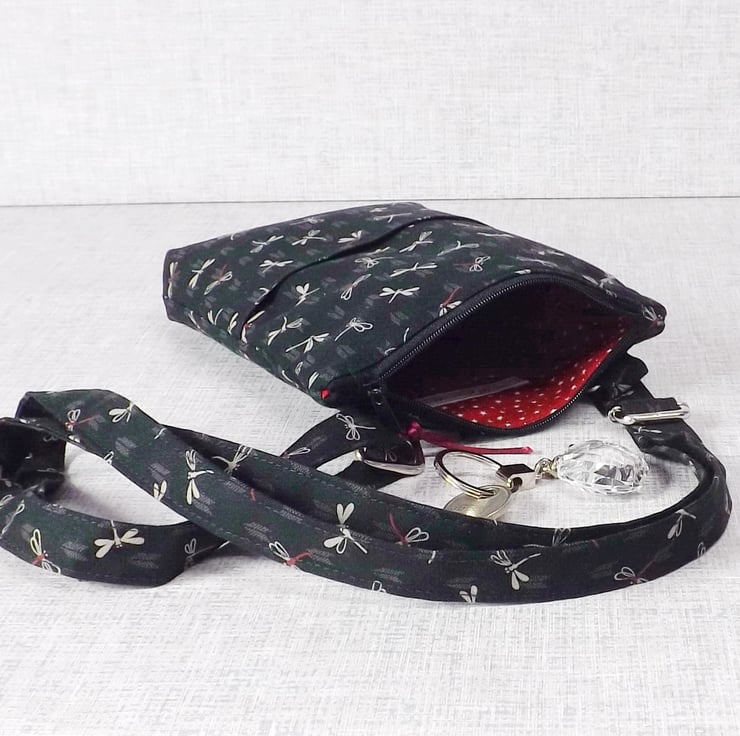 A phone bag or small cross body bag made from 100% cotton fabric. The main fabric has a dragonfly design in shades of beige and red on a black background. The lining is red cotton with white stars on it.