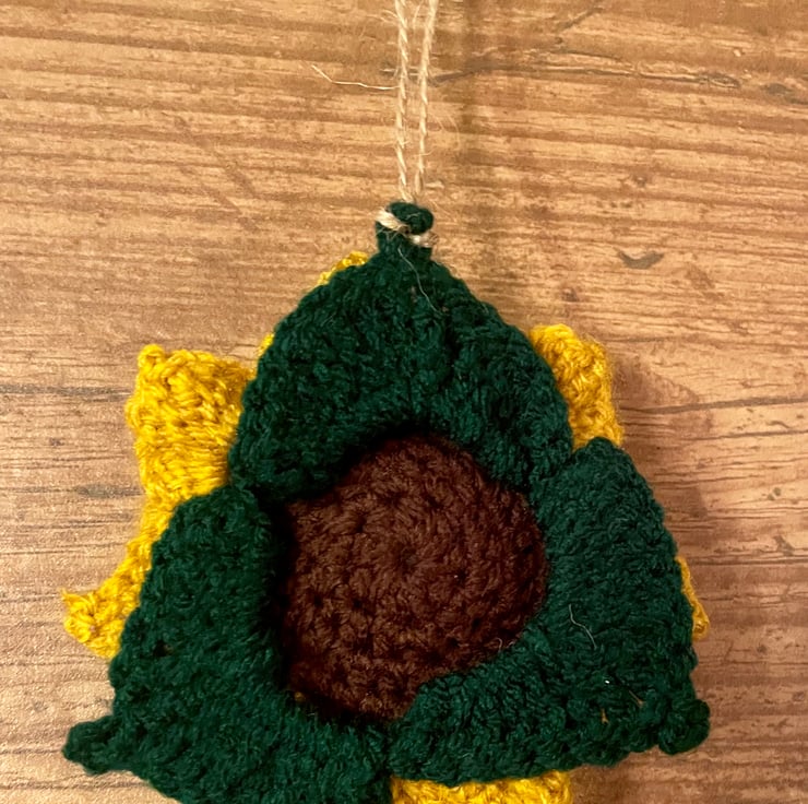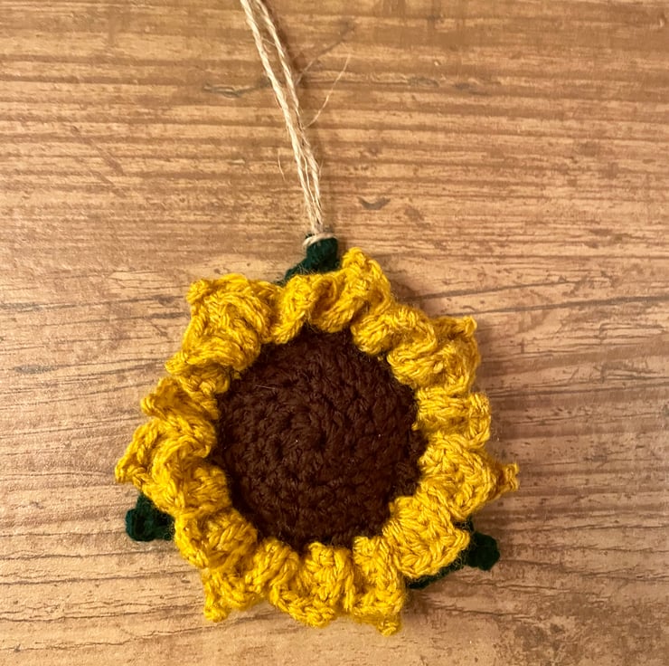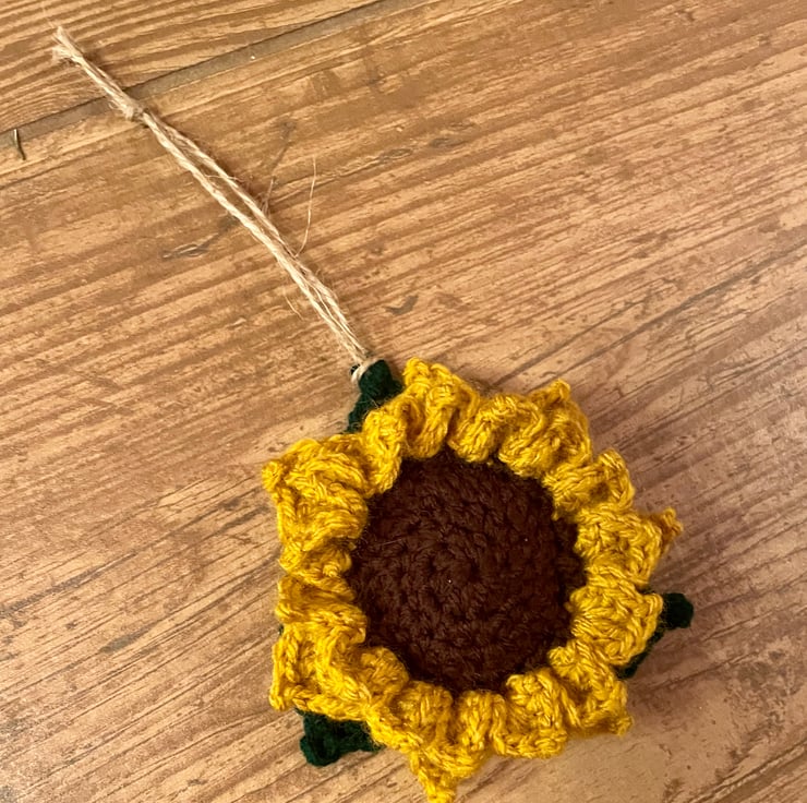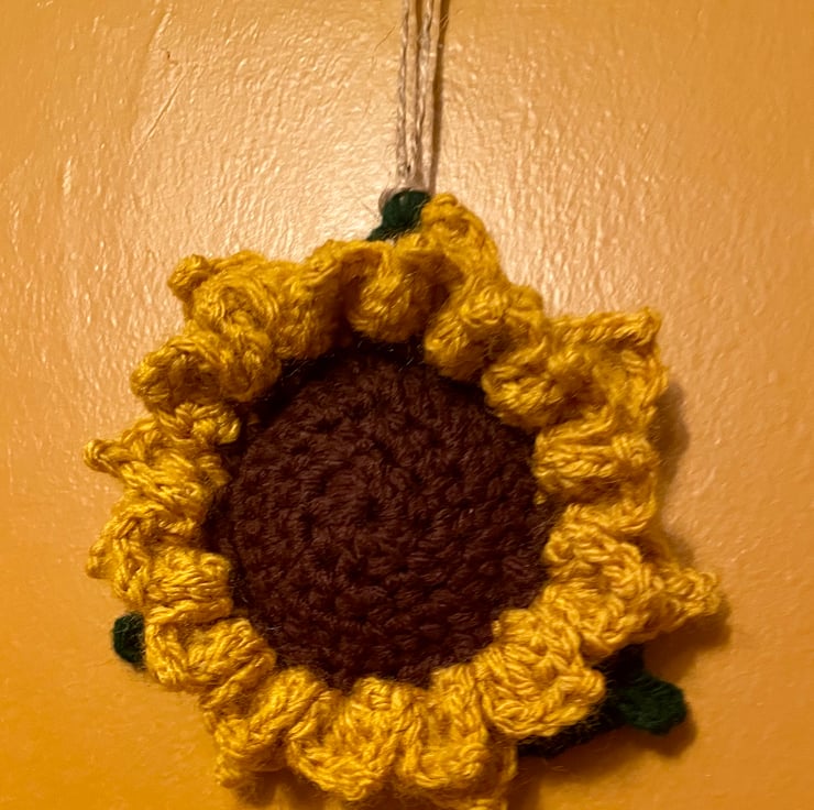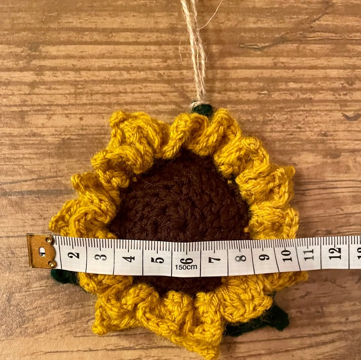 The crocheted sunflower is made with acrylic yarn with a twine hanger that can be easily removed. It measures approximately 11 cm diameter.