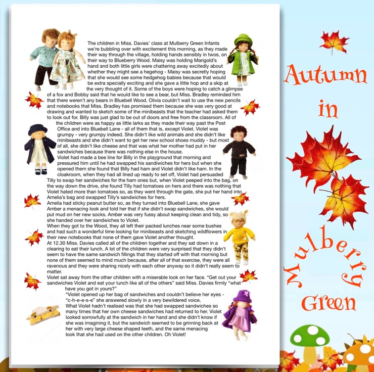 There are other children in Maisy’s class at school - Violet, Billy with his pet rabbit, Amber, Tilly, Rosie and her kittens, Amelia, Ruby, Marigold, Bobby with Max the dog, and the twins Oliver and Olivia, who have a puppy called Oscar. The dolls are all 26cm tall and baby Daisy is 16cm. Maisy and Mo love nothing more than having adventures with their friends. You can read about their adventures on my Facebook and Instagram pages - Maisy Muffin Rag Dolls and on my Mulberry Green Pinterest boards.