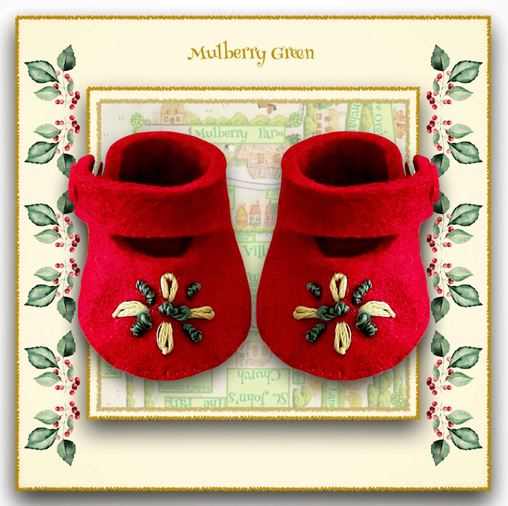 A pretty little pair of red embroidered red shoes, to fit the Mulberry Green characters. They fasten with a little popper underneath a button and match the foraging dress and embroidered red cardigan.