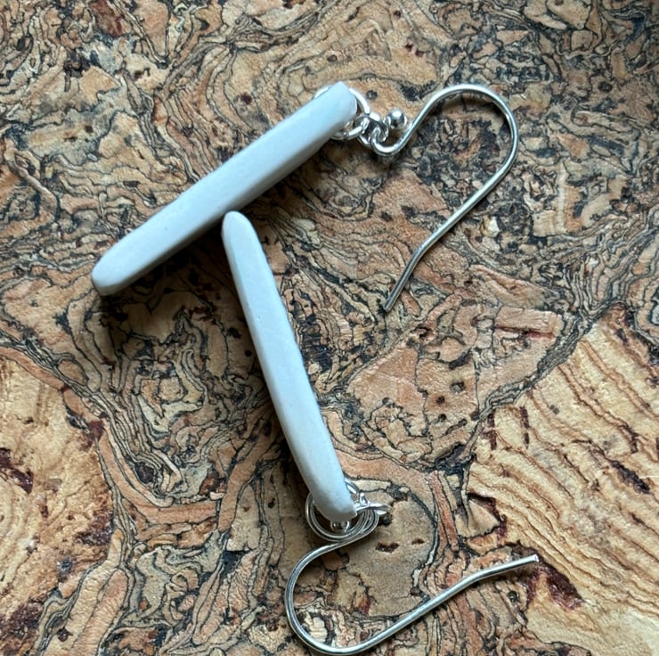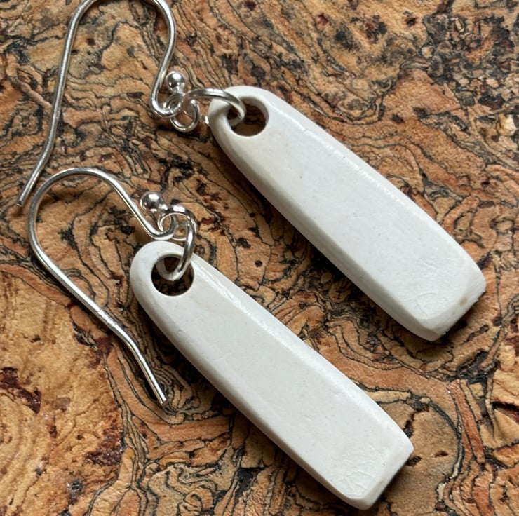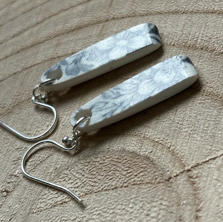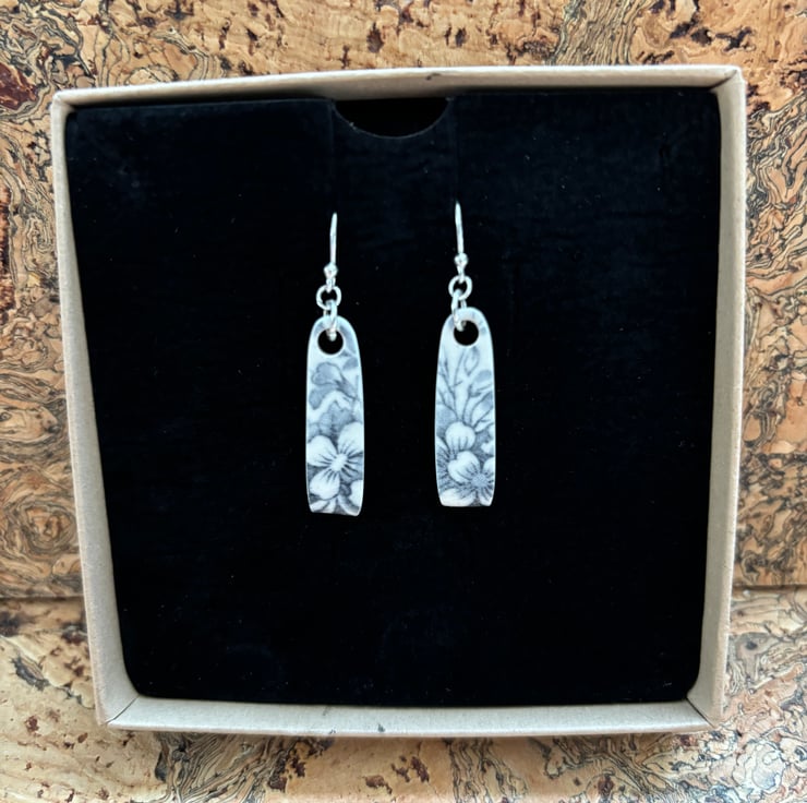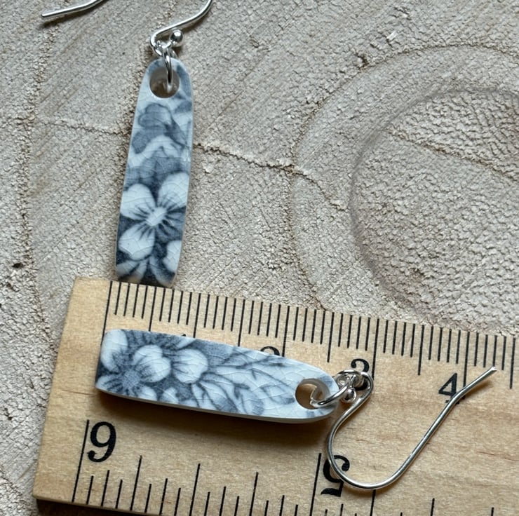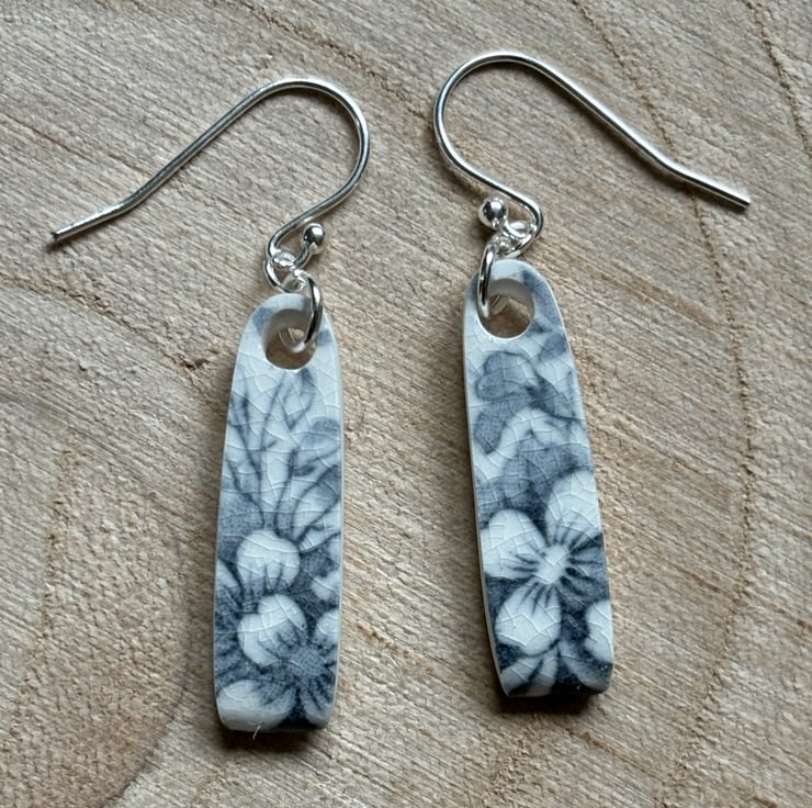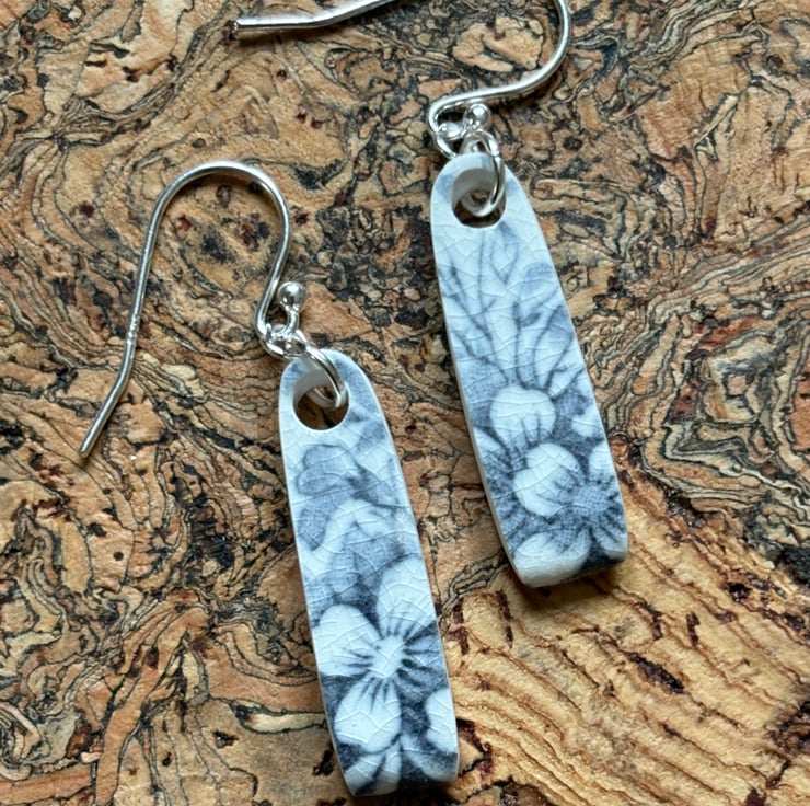 I found a quite chunky piece of ceramic, rim of a plate, stained, crackled glazed with a beautiful blue flower pattern. After a clean I was able to drill holes and shape into earrings. Front and back glaze in tact, the area around the hole is sanded and sealed with eco friendly matt sealant. Similar in size and shape, not exact, ceramic thicker by the hole and tapers to the rim.
