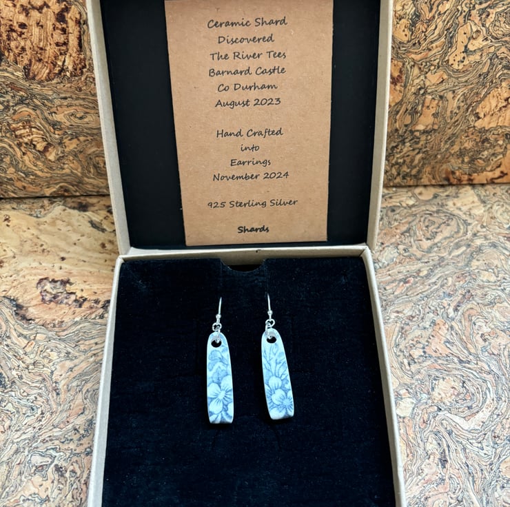 Hand crafted Jewellery and framed artworks using pre loved and discarded ceramics. Ceramic material will show signs of wear and damage. Entire process is a creative experience from discovery to final picture, nothing planned or preconceived. All materials personally collected from river banks, charity shops, roadside, woods, recycle centres, beaches, wherever dropped, dumped or donated ceramics are found, cleaned and shaped into new stories. Each piece comes with a short bio of where the ceramic came from, date found and re-created. Some shards collected are used as found, others are cut randomly which shape the final work. Every piece is individual, nothing replicated, however, due to repetitive patterns in ceramics there will be some similarity but only through the ceramic material not in the final piece.