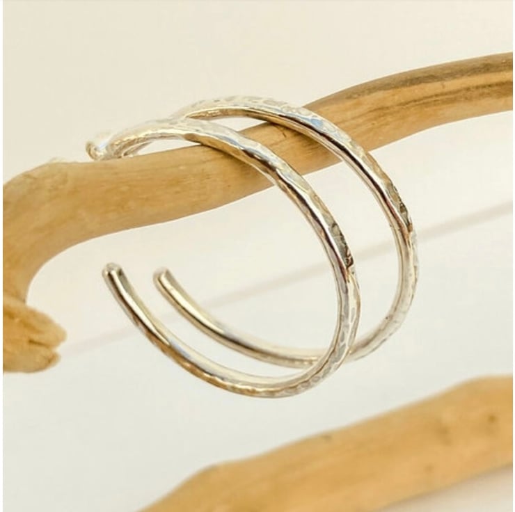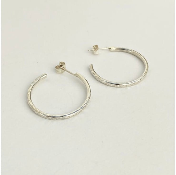 Simple and elegant silver hoops, made from sterling silver and with a delicately textured finish which glitters when they catch the light. Earrings have a silver ear post and butterfly backs. Beautifully crafted from recycled silver and polished by hand to a high shine finish using traditional silversmithing techniques.