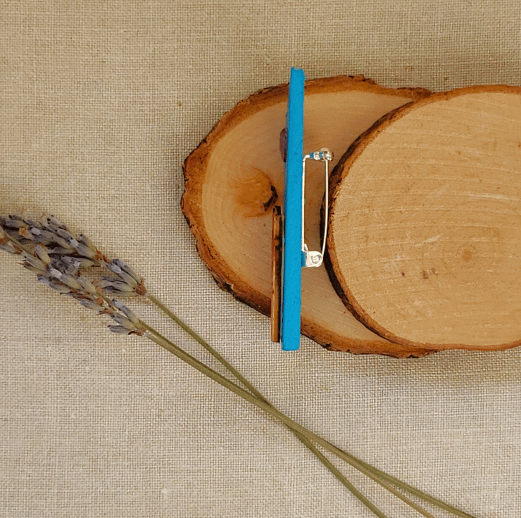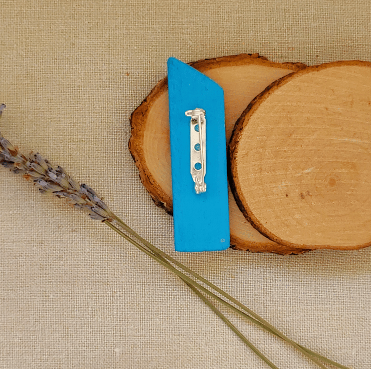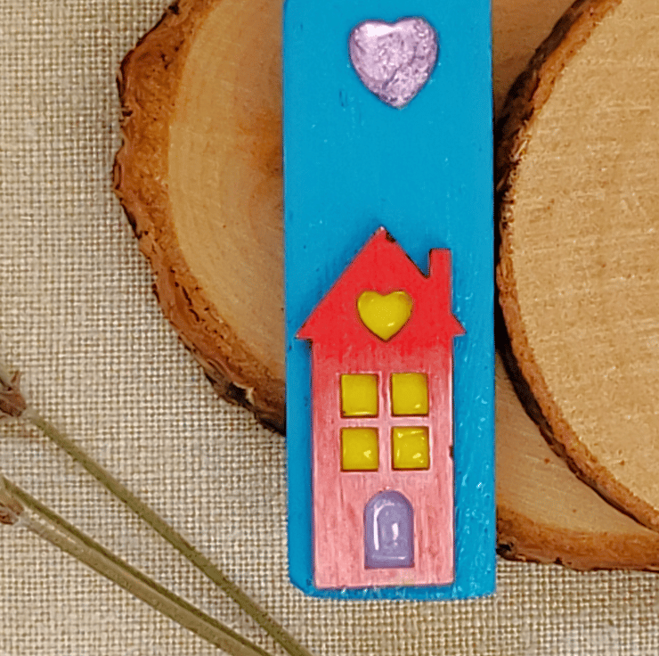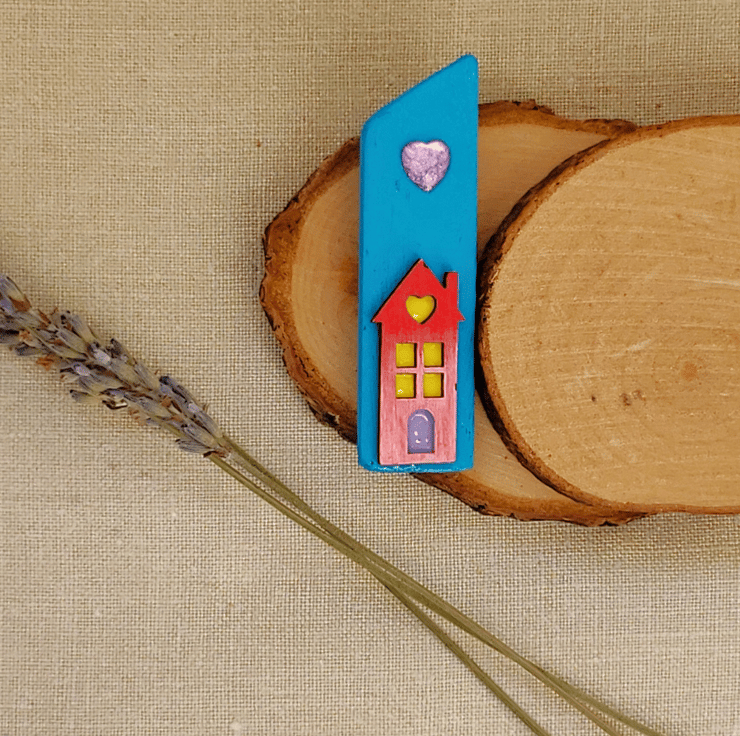 Made using scrap canvas pegs and recycled wooden blank. This house brooch is hand painted using colours I've mixed myself using acrylics. I've added a background to the house to give it some light and added a small recycled jewel to finish.