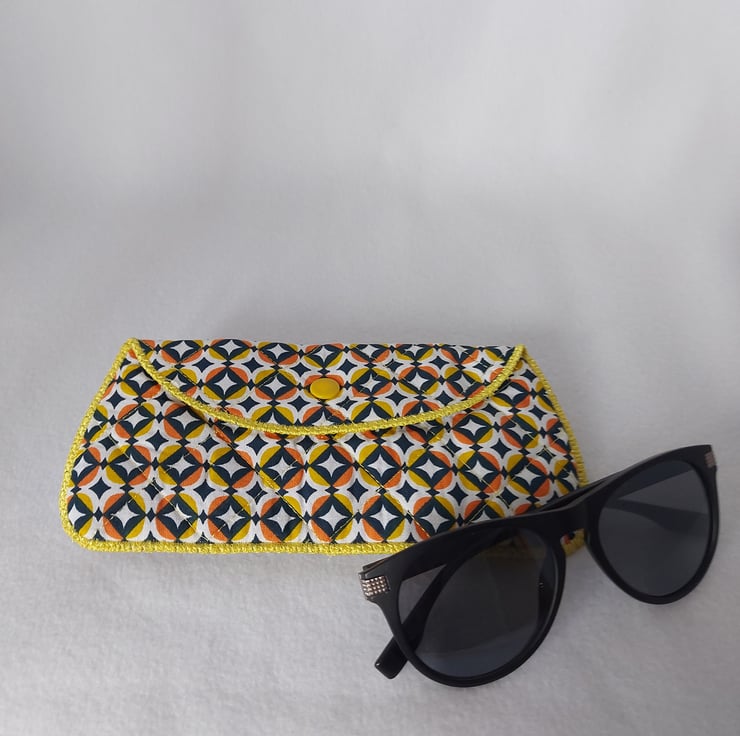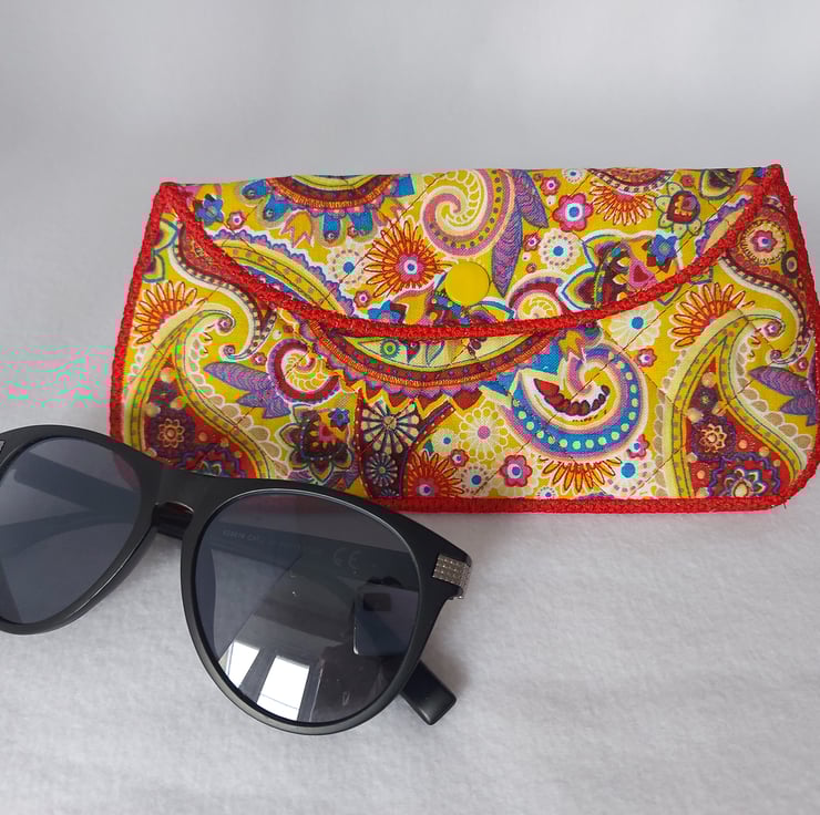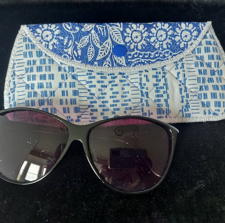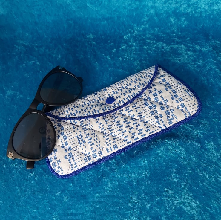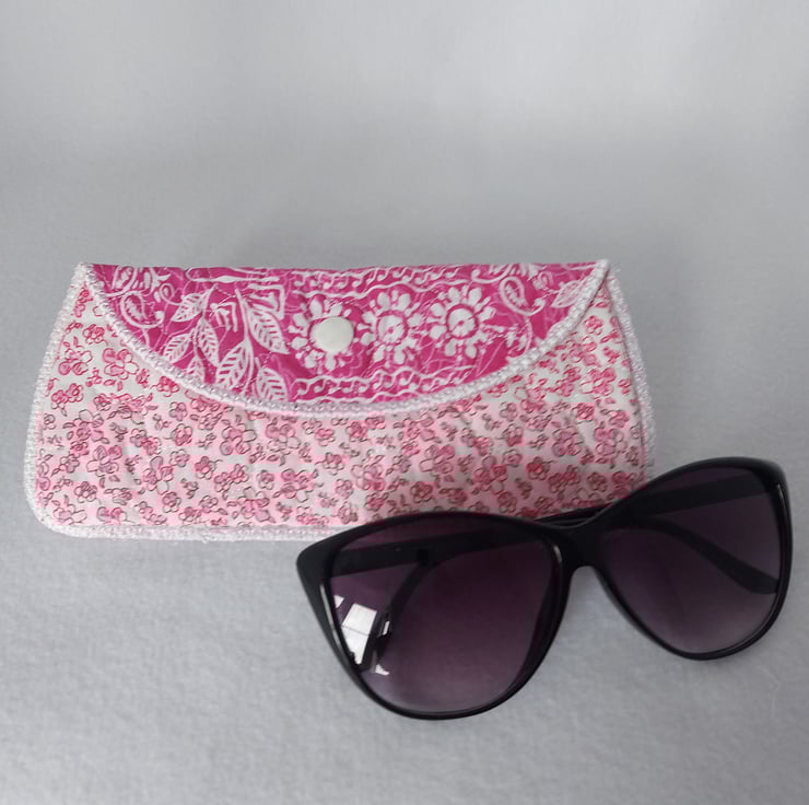 Pretty quilted padded glasses case, can be used for spectacles or sun glasses. Approximate size is 17cm wide x 8cm high.