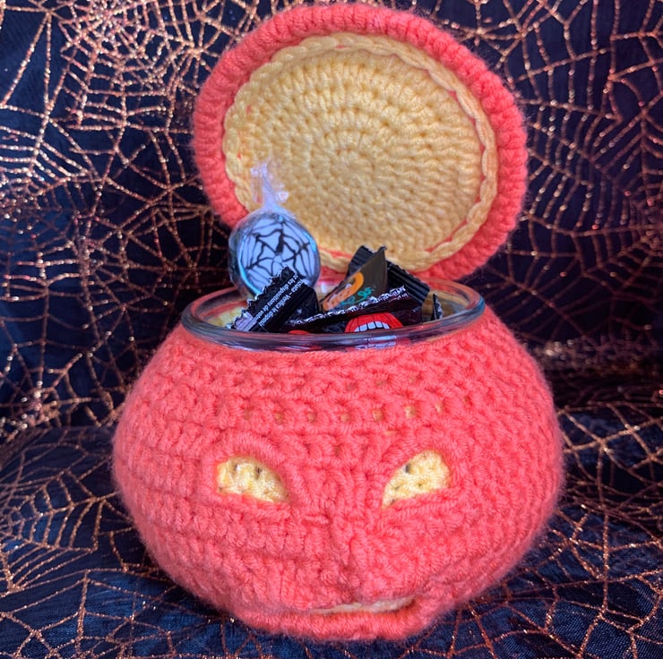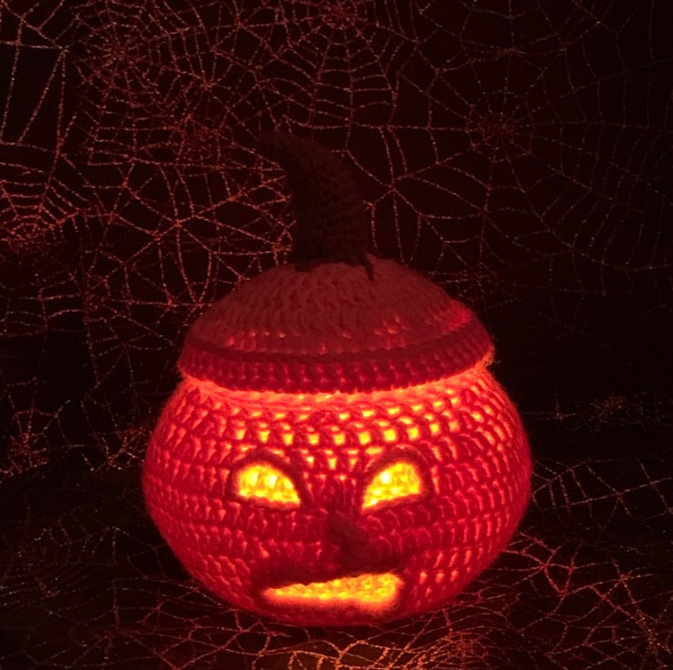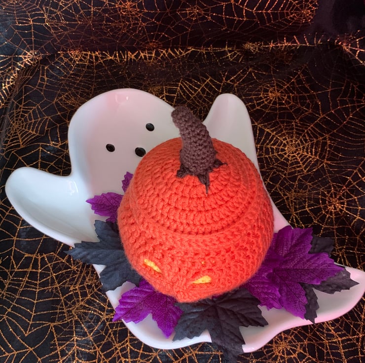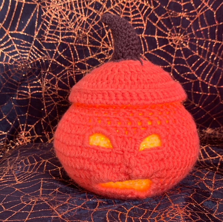 Unique light up crochet pumpkin lantern, perfect gift for the upcoming spooky season. Comes with small selection of sweets and 2 x LED tea lights. Makes a lovely decoration that can be used for many years to come. Made to Order.