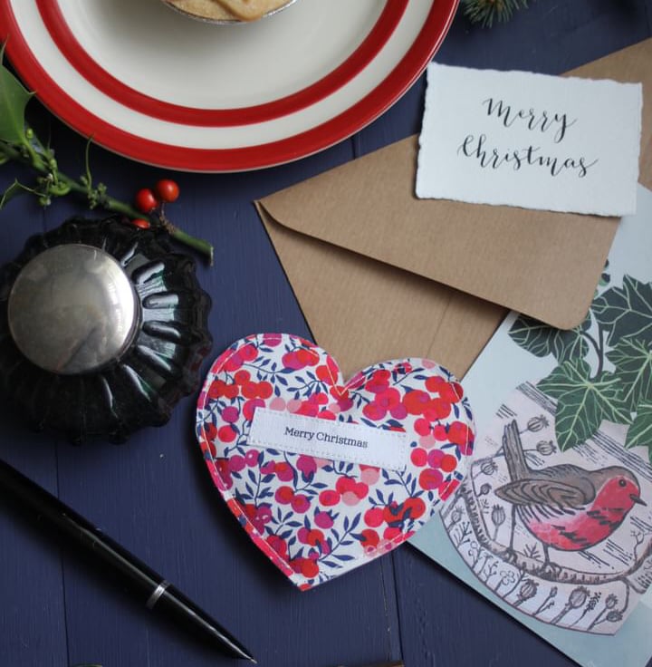 A simple lightly padded heart made in a range of Christmassy fabrics, including Liberty and William Morris designs. Each heart has the words 'Merry Christmas' sewn onto the front and contains a selection of festive spices, including cloves, cinnamon and star anise. It makes an ideal 'little something' for popping in with a Christmas card or a surprise stocking filler.