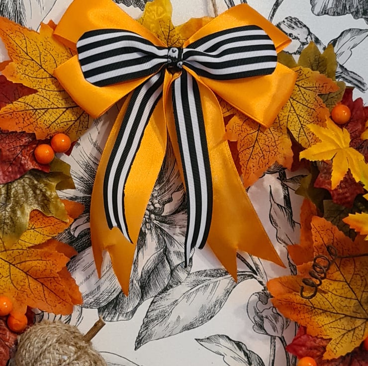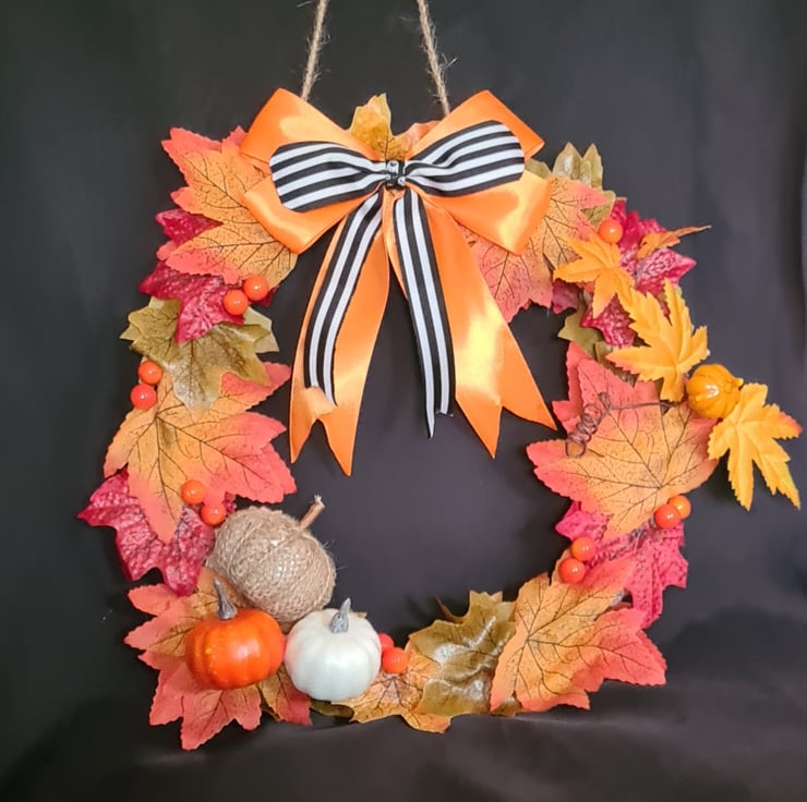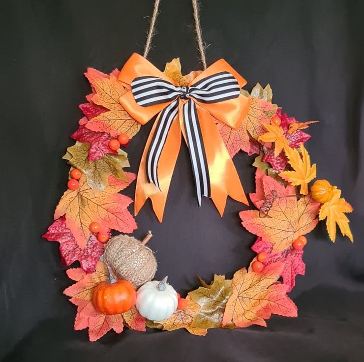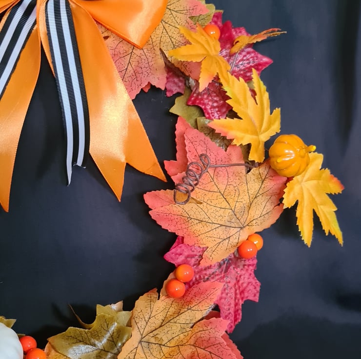 Decorated with faux pumpkins, faux berries, faux leaves and Orange Satin Ribbon with a Grosgain black and white striped ribbon design. For use Indoors Only. Wreath has a flat back decorated with leaves only.