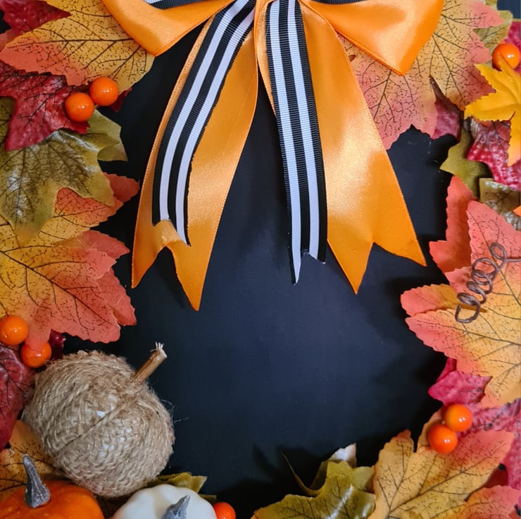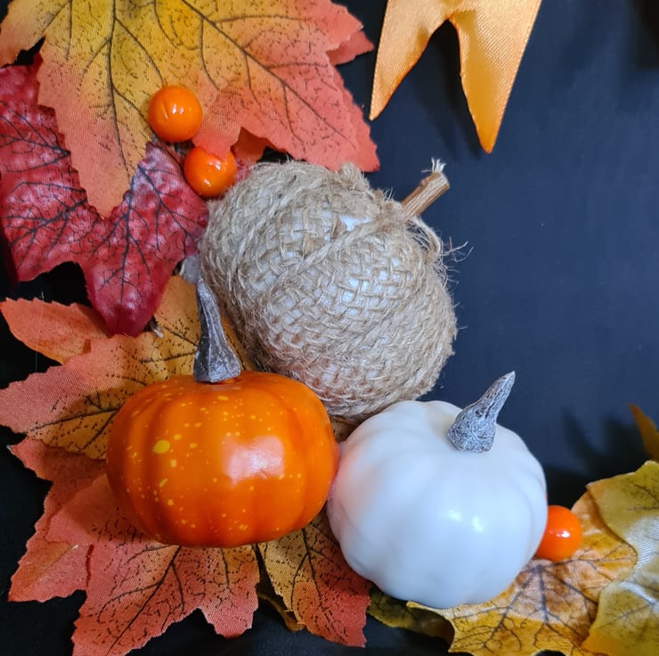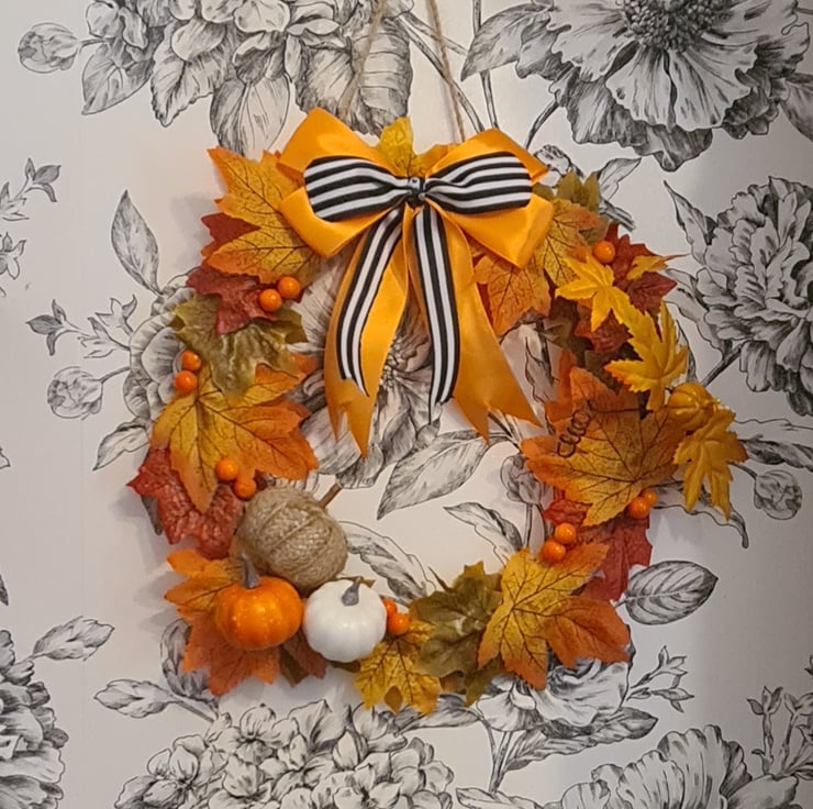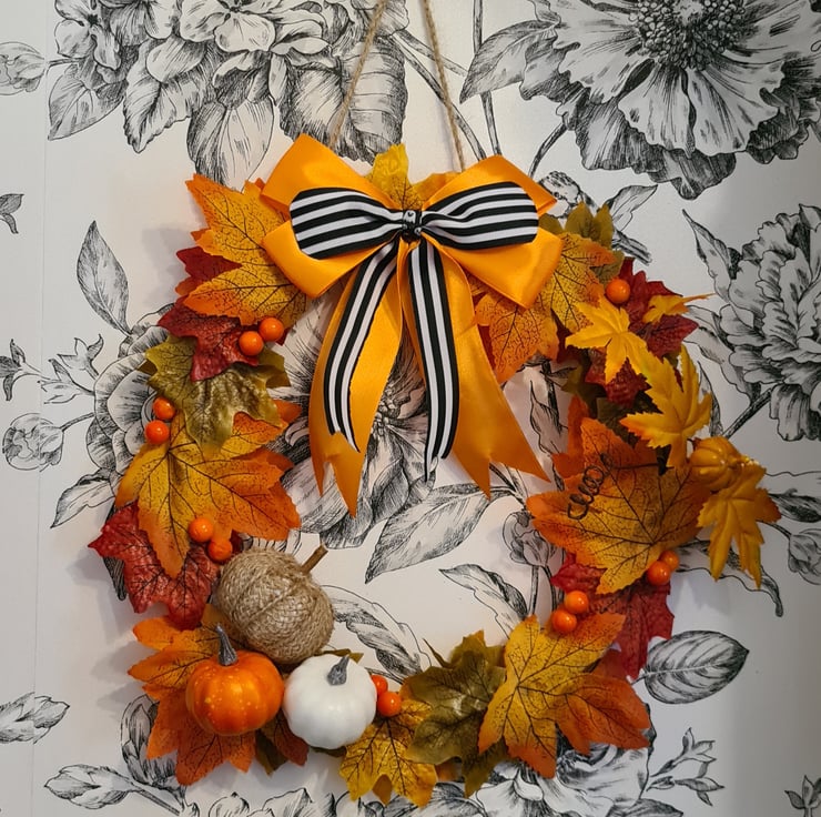 A lovely wreath to hang on door or wall. Gorgeous Autumn colours with pumpkins, orange "Berries" and a fabulous orange ribbon. A fantastic indoor decoration or maybe to hang inside a window.