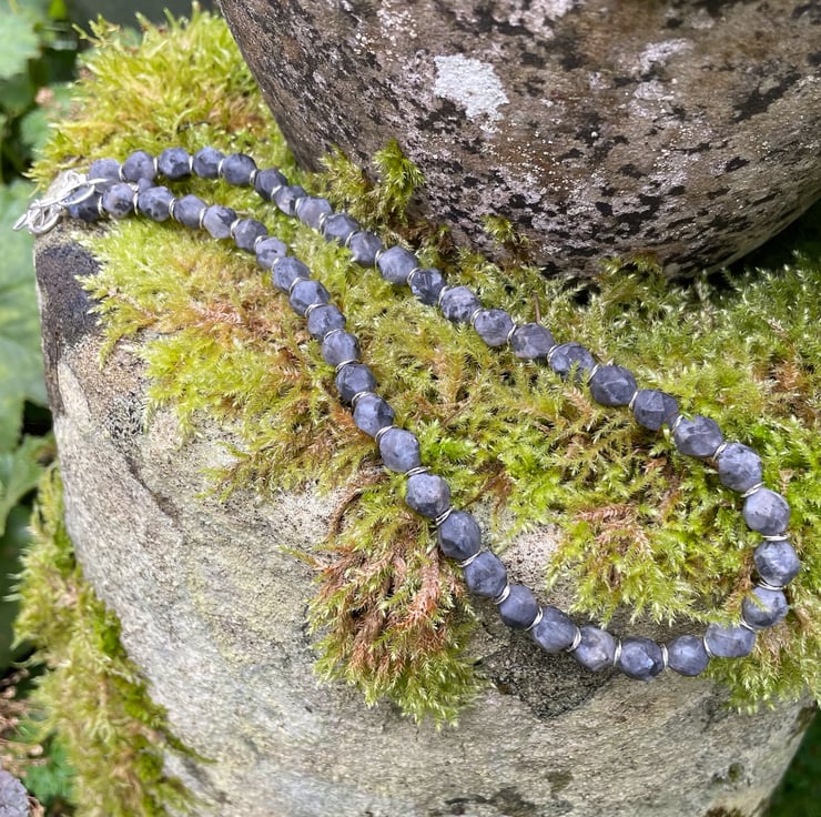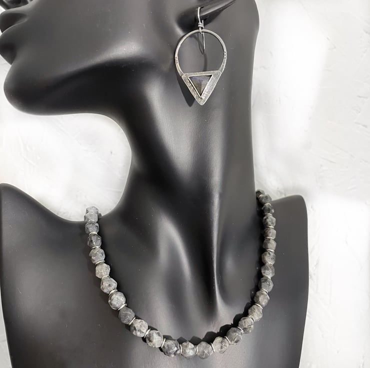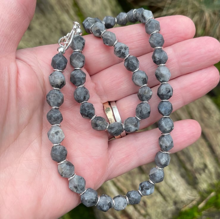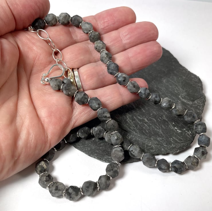 The labradorite beads are an unusual shape. Softly faceted rounds, they have a variety of different greys within and an icy blue shimmer in some light.