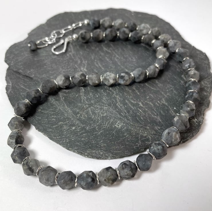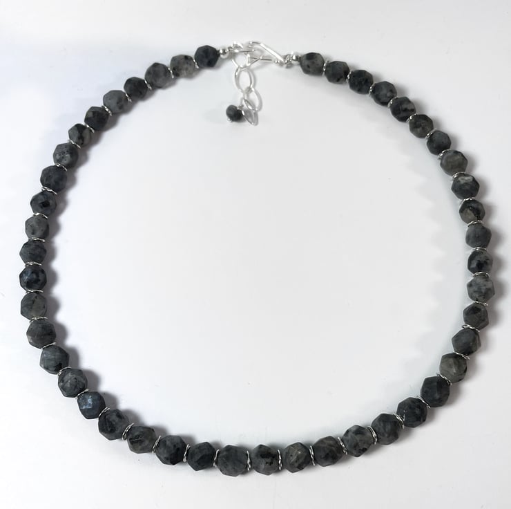 Black labradorite beads with a frosted finish have been combined with polished silver to make this bold yet sophisticated necklace.