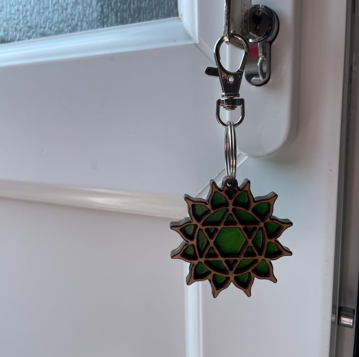 The finished Heart Chakra Keyring measures approx. 5cm wide x 10cm long
