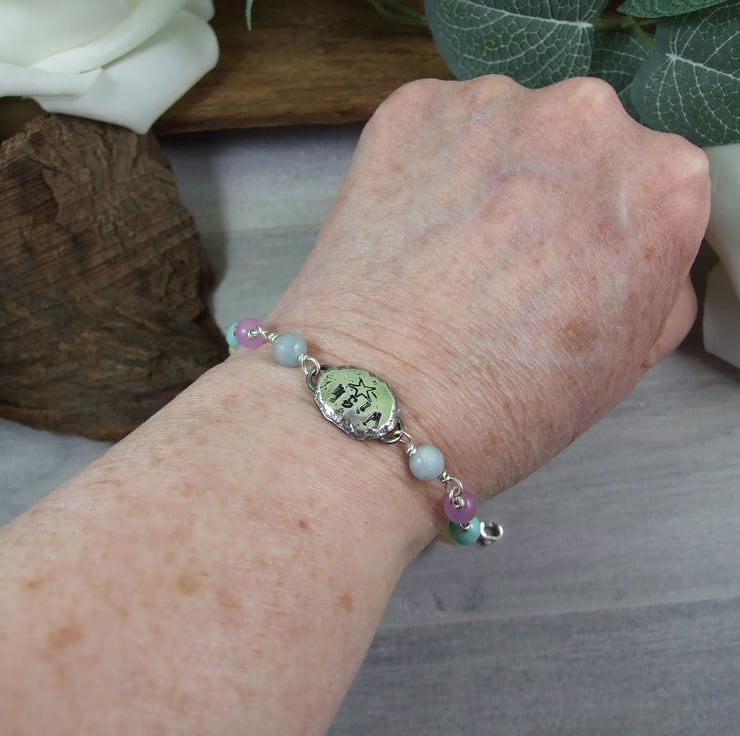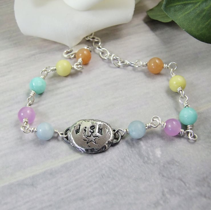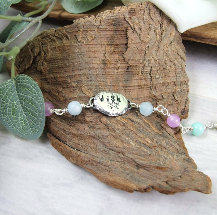 I have made the bracelet from a mixture of 6mm gemstone beads of Aquamarine, Dyed Jade and Agate. The silver nugget centre is handcrafted from sterling silver, heated to melting point and then flattened. To this I have hand stamped the word Wish and a little star below. The gemstones and fittings have all been wired securely together with wrapped wire loops and added a lobster clasp closure with a length of chain.